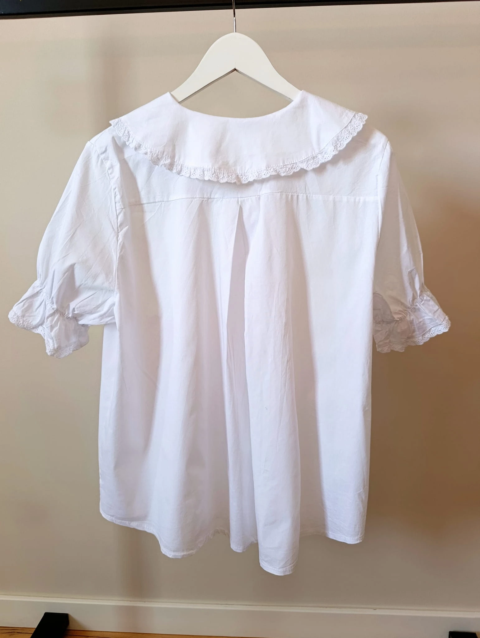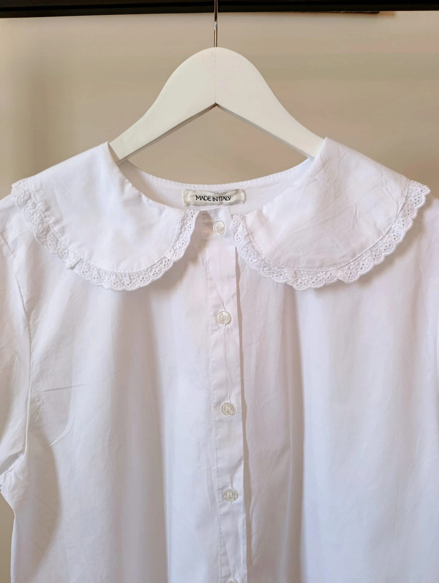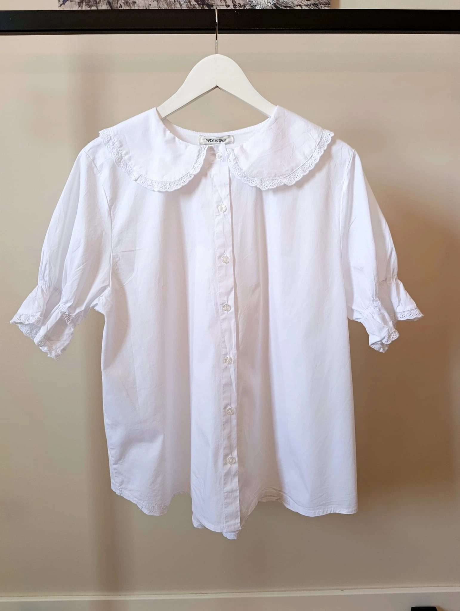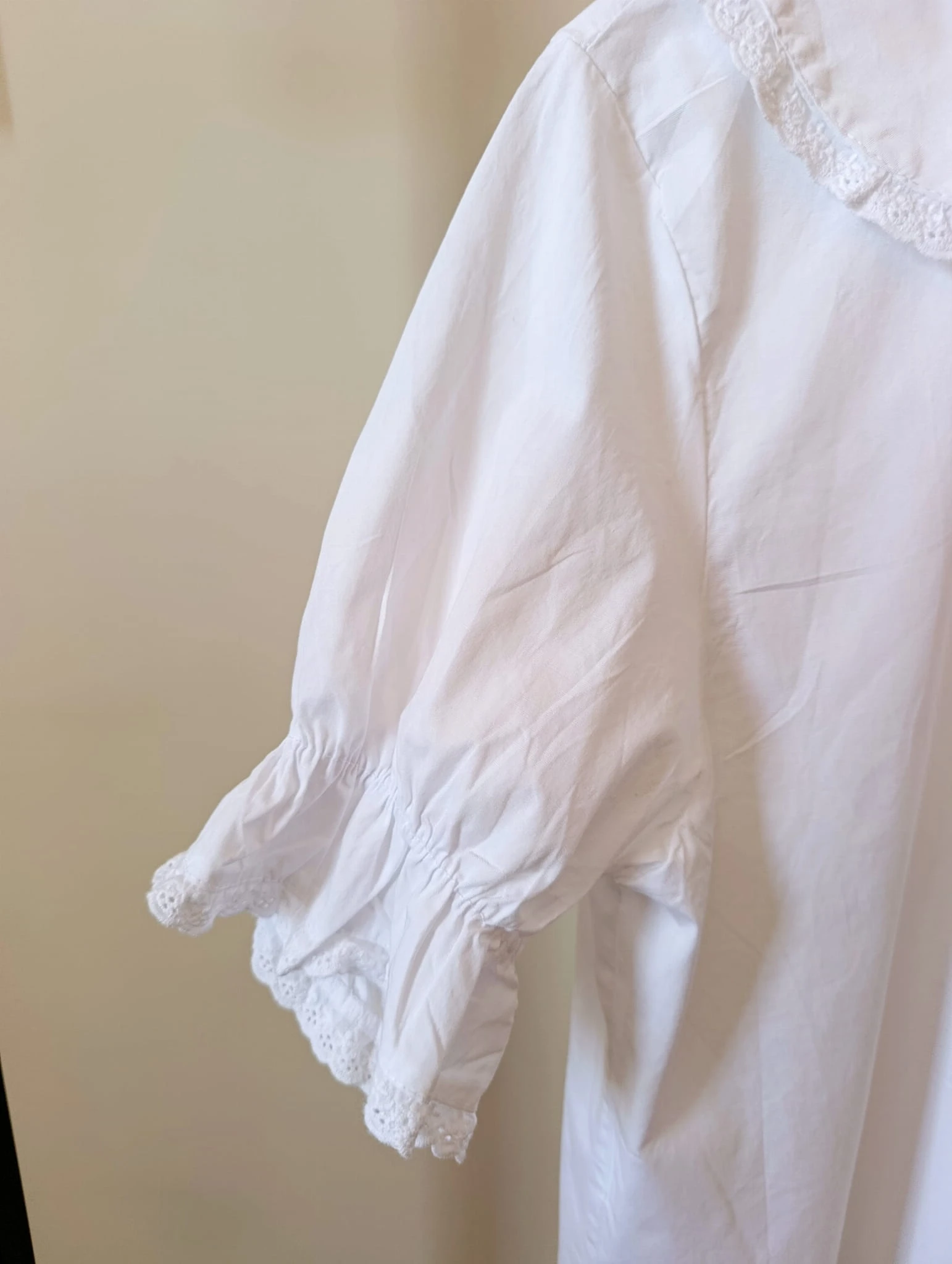 Elegancka koszula damska w kolorze klasycznej bieli, wykonana z naturalnej, oddychającej bawełny. Model inspirowany staropolskim stylem, który łączy subtelną romantyczność z nutą vintage. Kołnierzyk oraz krótkie rękawy wykończone są delikatną, wyszywaną koronką, co nadaje całości wyjątkowej lekkości i kobiecego uroku.