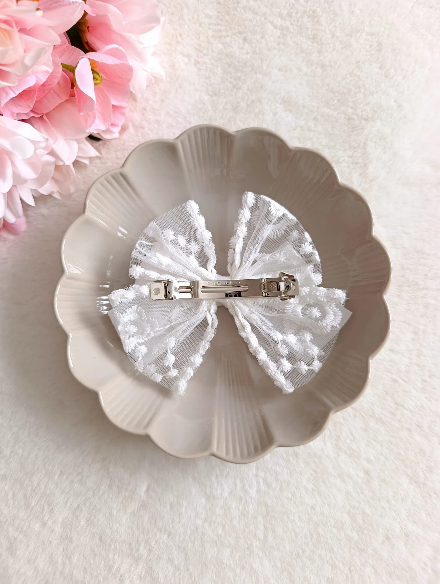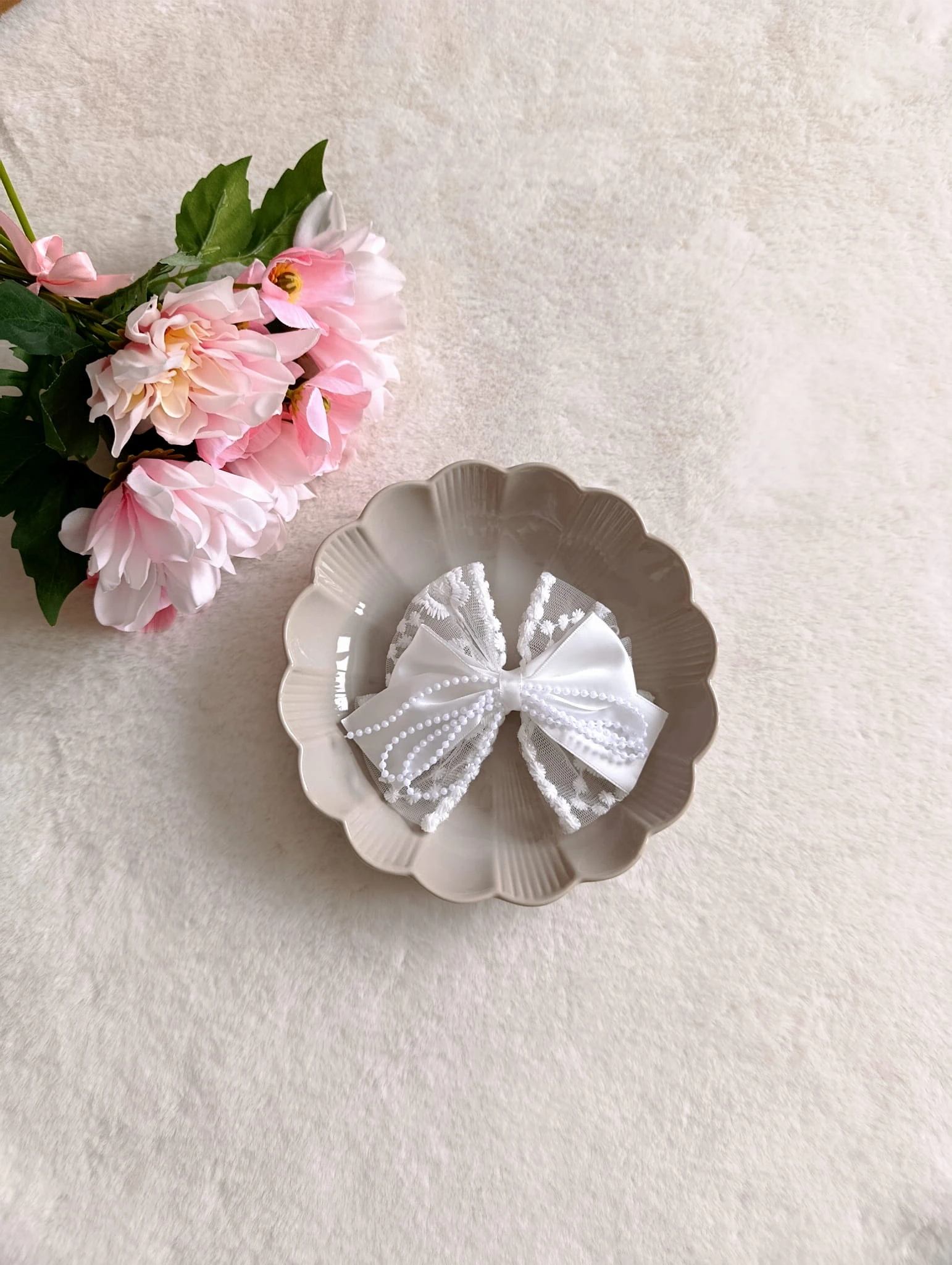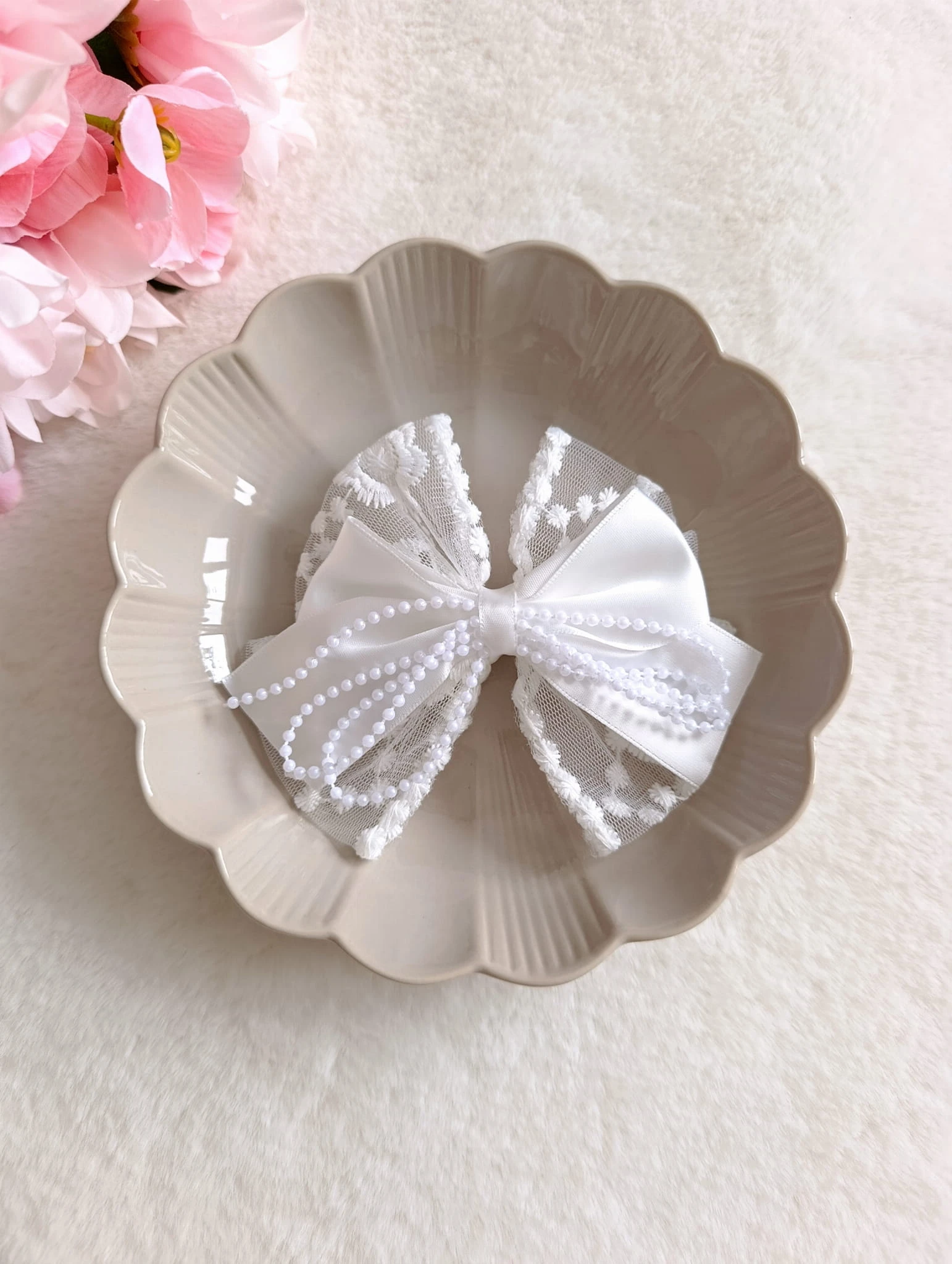 Elegancka spinka do włosów dla dziewczynki w klasycznym, uroczystym stylu. Duża kokarda wykonana została z wysokiej jakości satyny w śnieżnobiałym kolorze, subtelnie ozdobionej delikatną koronką, która nadaje całości lekkości i wyjątkowej elegancji.