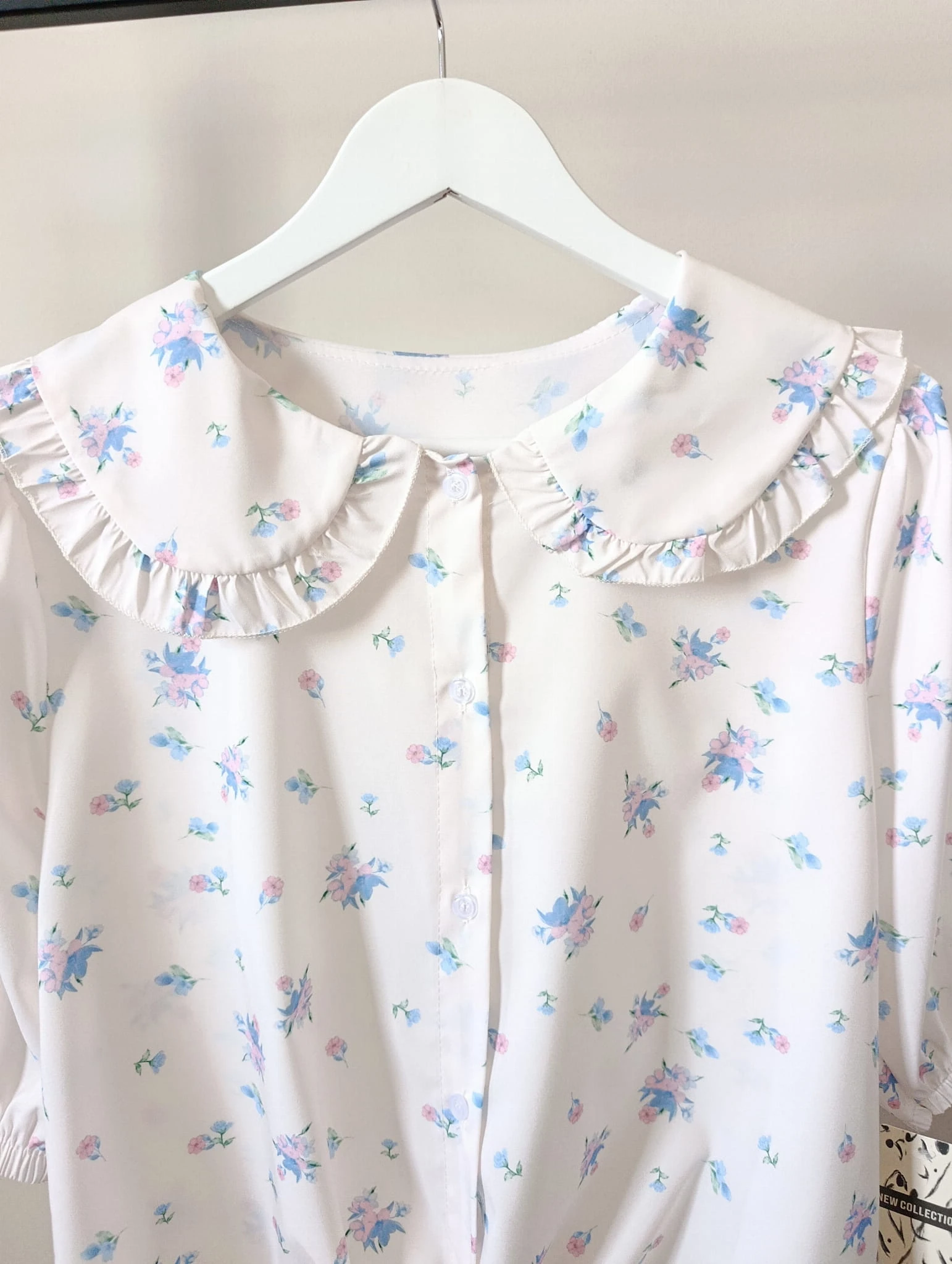 Elegancka, a zarazem lekka i dziewczęca koszula damska w kolorze białym, zapinana na guziki. Wyróżnia się ozdobnym kołnierzykiem, który dodaje jej subtelnego uroku i wyjątkowego charakteru, Całość zdobi delikatny print w drobne kwiatki w odcieniach niebieskiego i różu, nadający koszuli świeżości oraz romantycznego stylu.