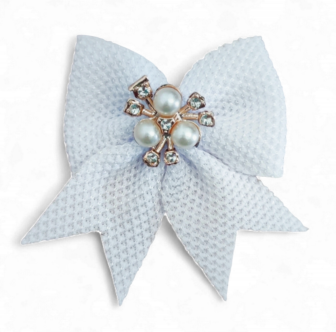 Elegancka spinka w kształcie tłoczonej kokardki, ozdobiona subtelnymi perełkami i błyszczącymi cyrkoniami. Delikatna i urocza - doskonała na co dzień, do przedszkola, jak i na wyjątkowe okazje: urodziny, święta, sesje zdjęciowe.