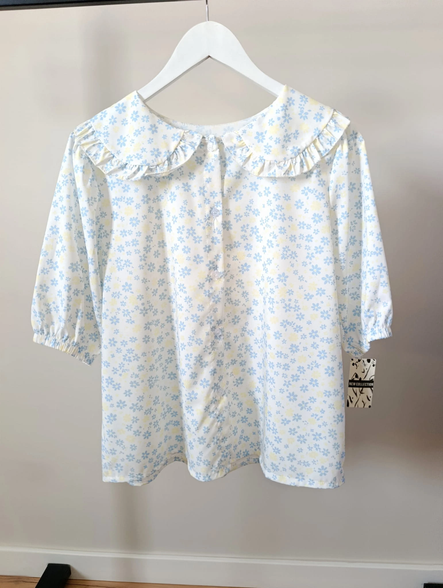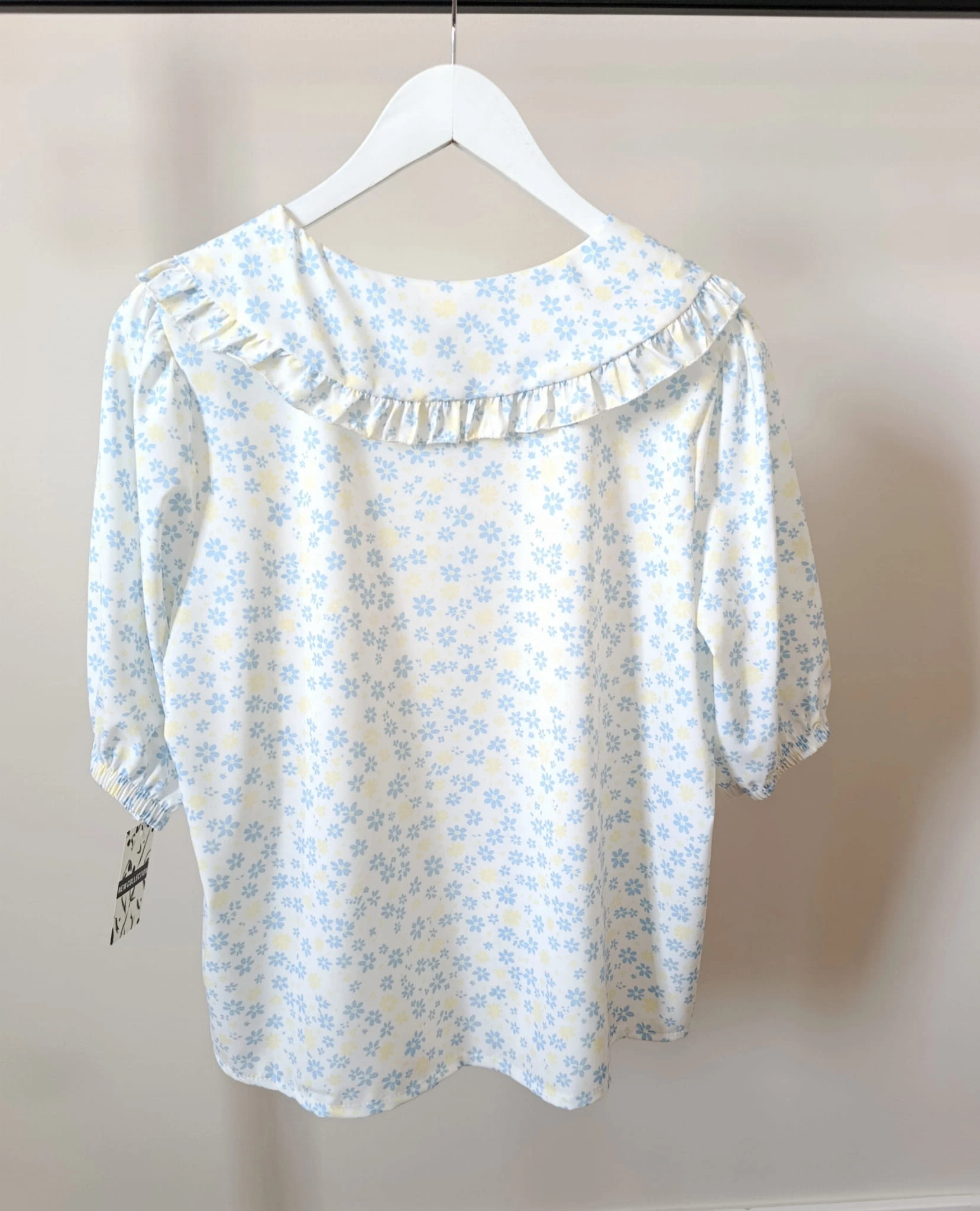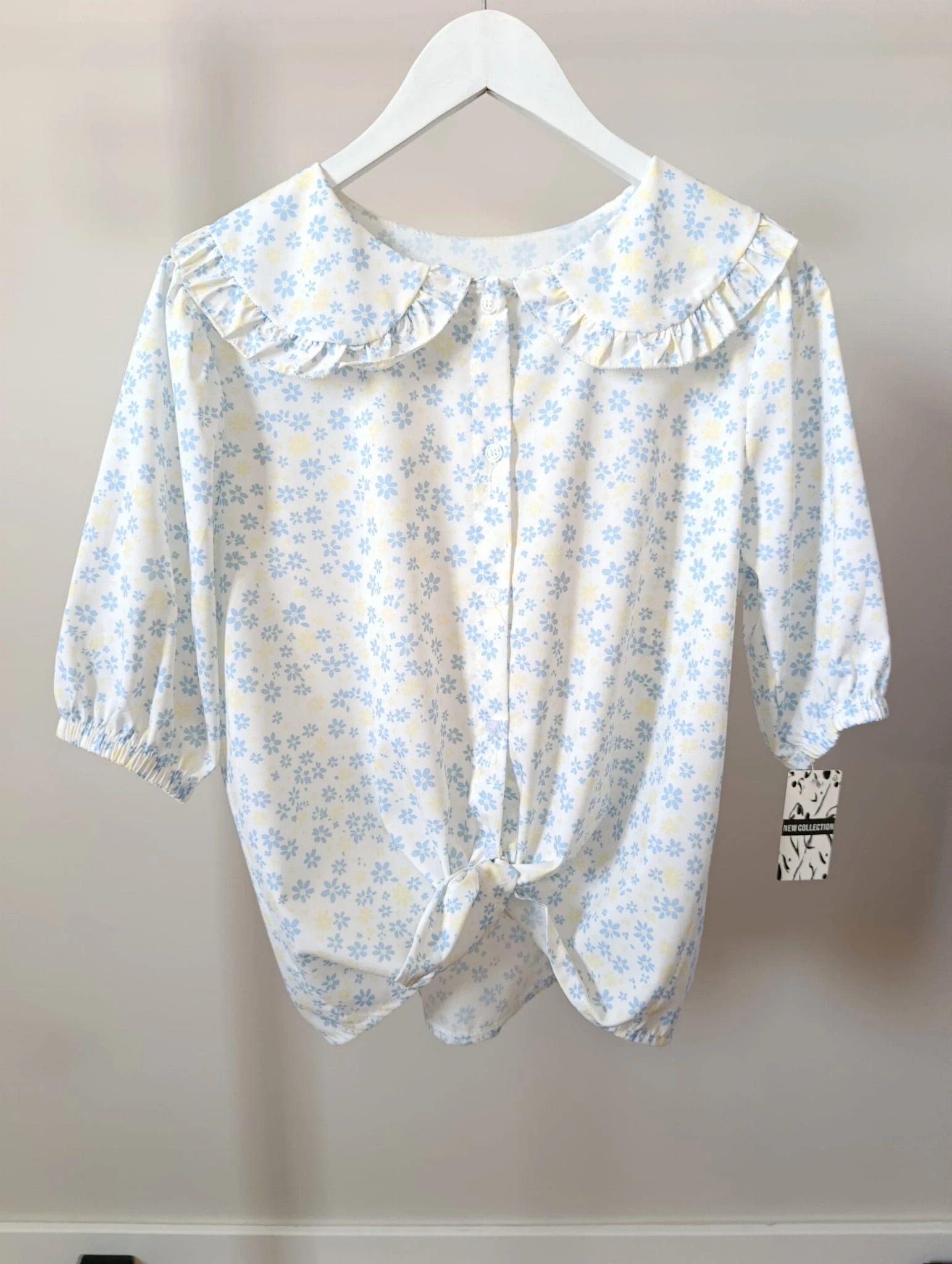 Elegancka, a zarazem lekka i dziewczęca koszula damska w kolorze białym, zapinana na guziki. Wyróżnia się ozdobnym kołnierzykiem, który dodaje jej subtelnego uroku i wyjątkowego charakteru, Całość zdobi delikatny print w drobne kwiatki w odcieniach niebieskiego oraz żółtego, nadający koszuli świeżości oraz romantycznego stylu.