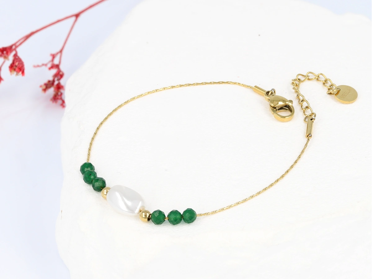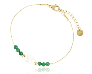 Bransoletka damska to połączenie subtelnej elegancji i naturalnego piękna. Wykonana ze stali chirurgicznej 316L w złotym kolorze, zachwyca trwałością i odpornością na codzienne użytkowanie. Jej delikatna formuła została ozdobiona perłą rzeczną oraz kamieniami malachitu, tworząc wyjątkowy i ponadczasowy dodatek.