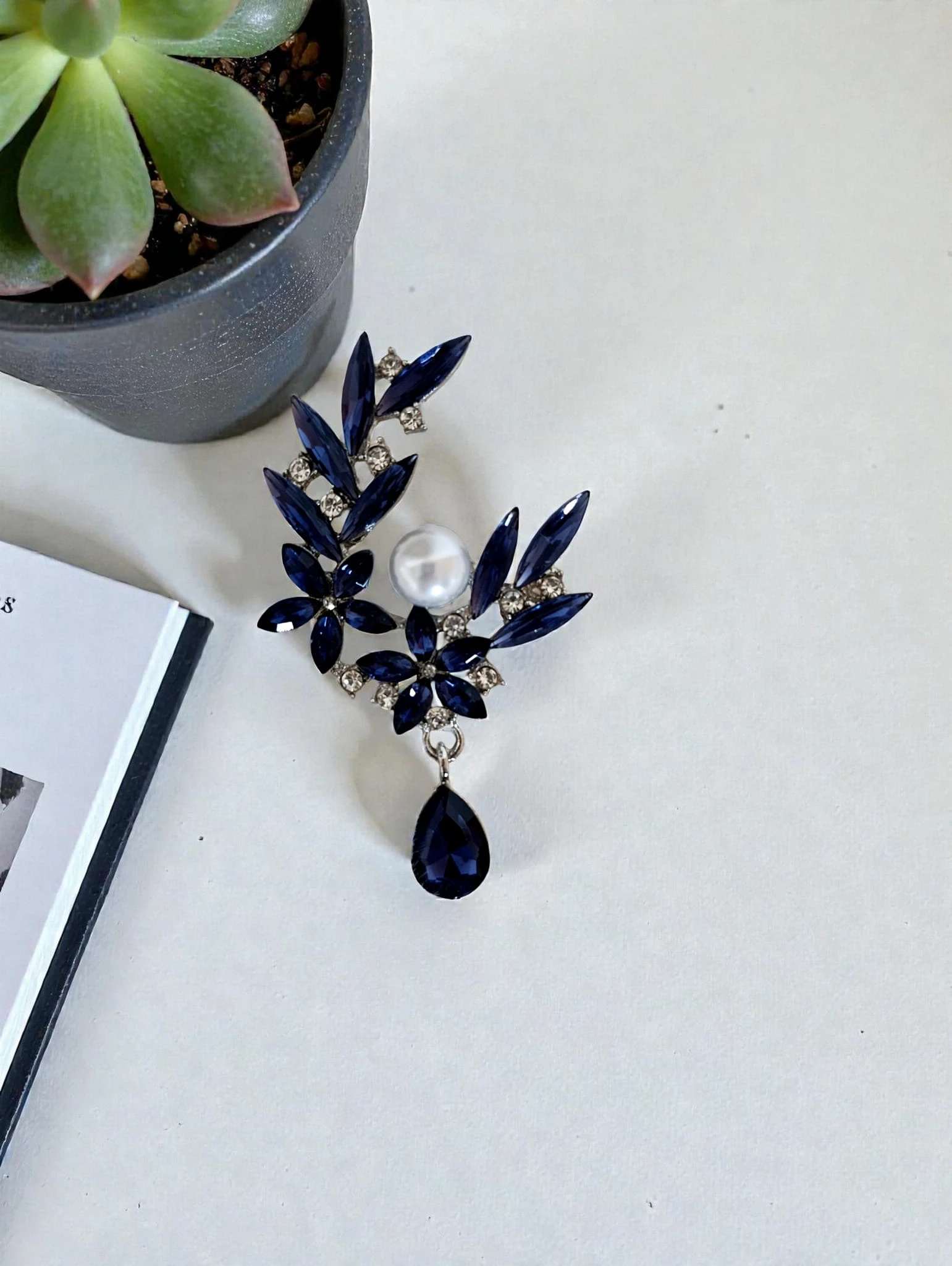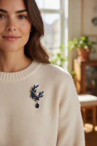 Kompozycję zdobią głębokie, granatowe kamienie, które pięknie odbijają światło i nadają całości szlachetnego wyrazu. W górnej części znajduje się duża, dekoracyjna perła - klasyczny symbol elegancji i ponadczasowego stylu. Poniżej delikatnie porusza się wisząca łezka z kamienia, dodając broszce lekkości oraz subtelnego blasku przy każdym ruchu.