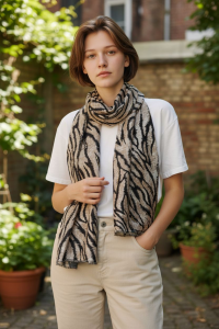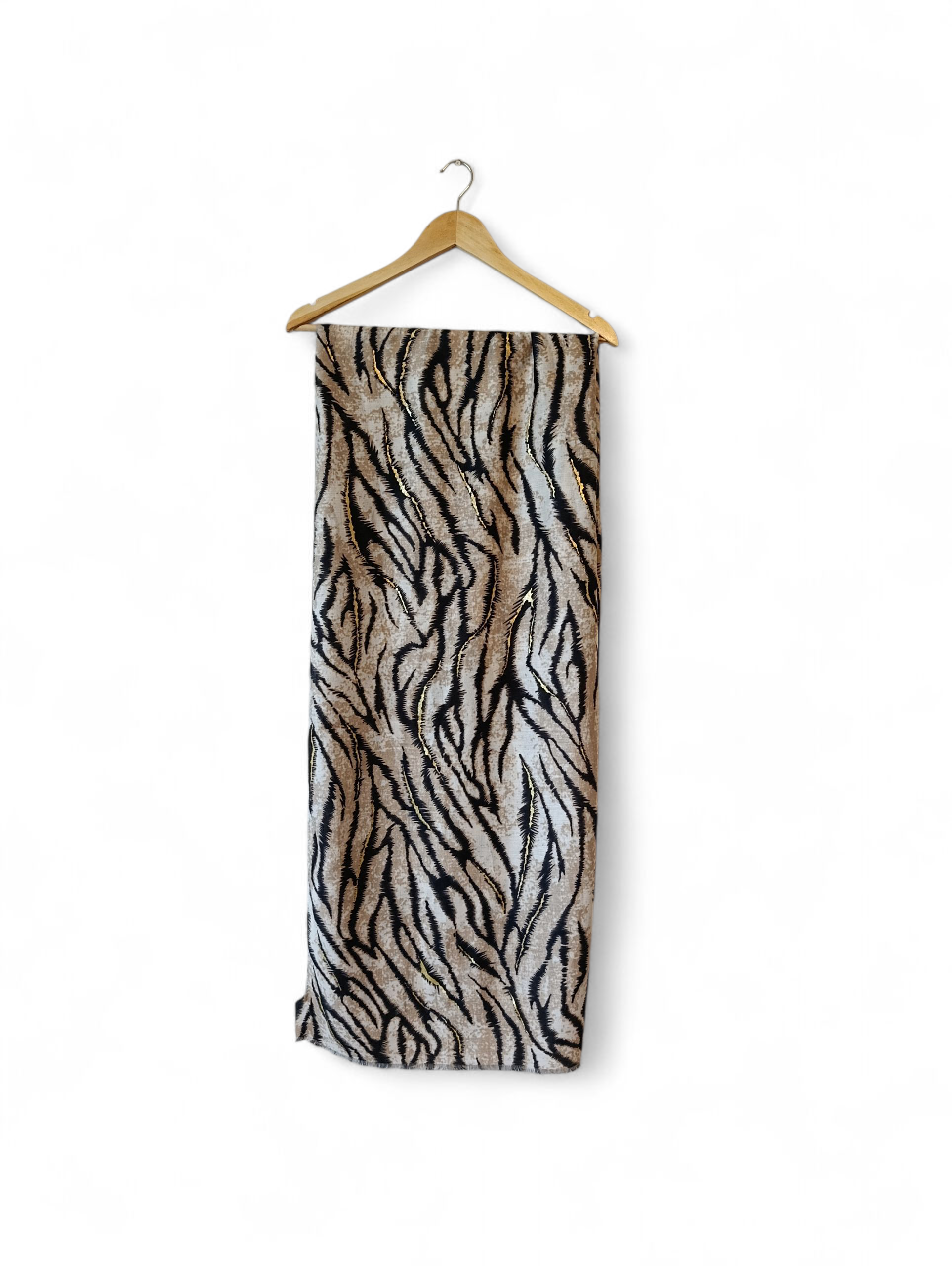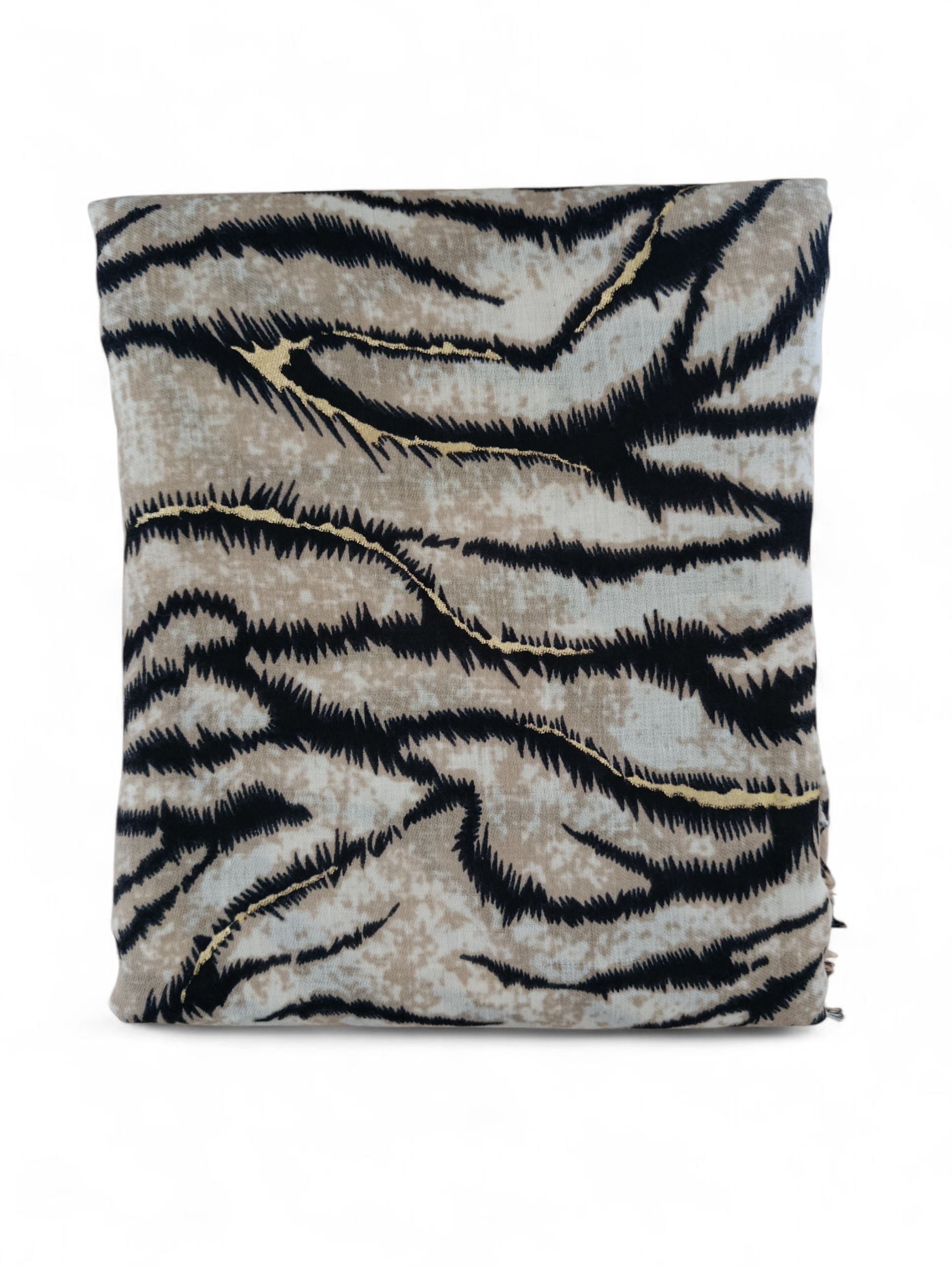 Ten wyjątkowy szal damski w odcieniach brązu, beżu i złota zachwyca subtelnym wzorem panterki, inspirowany naturą.