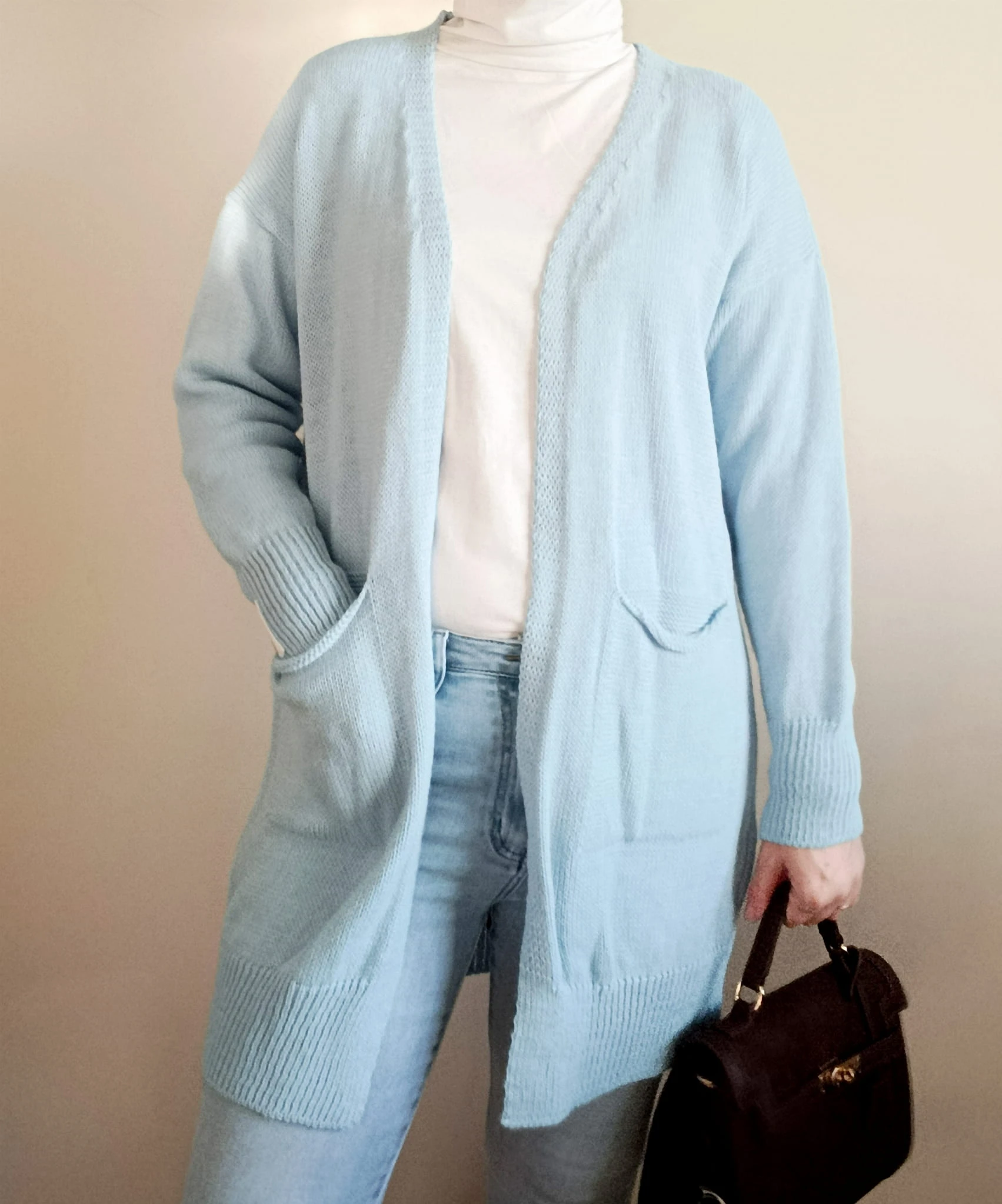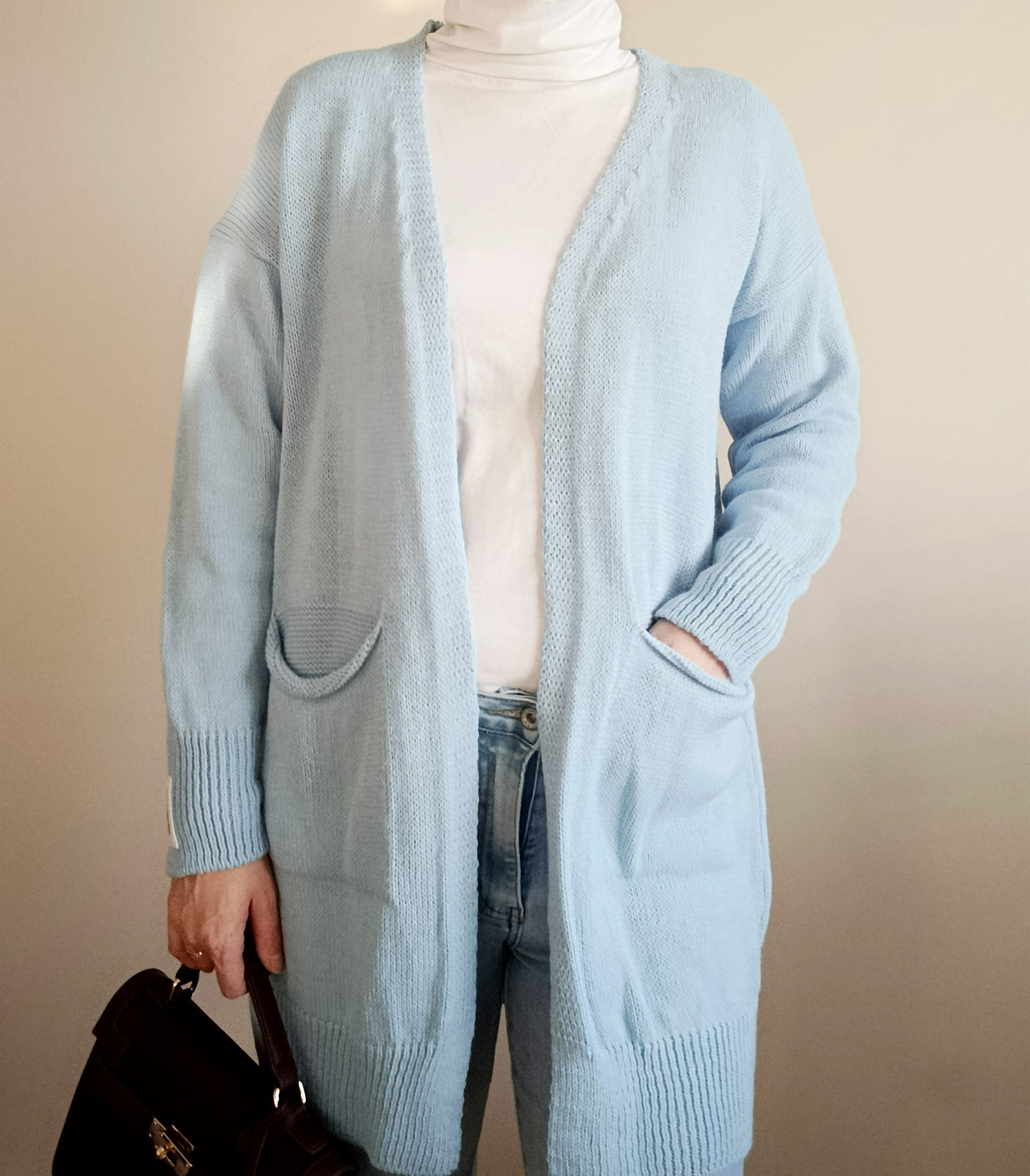 Stylowy i niezwykle komfortowy długi kardigan do kolan w modnym błękitnym kolorze, który rozświetli każdą stylizację. Wykonany z wysokiej jakości mieszanki moheru, wełny i akrylu, dzięki czemu jest ciepły, miękki i przyjemny w dotyku.