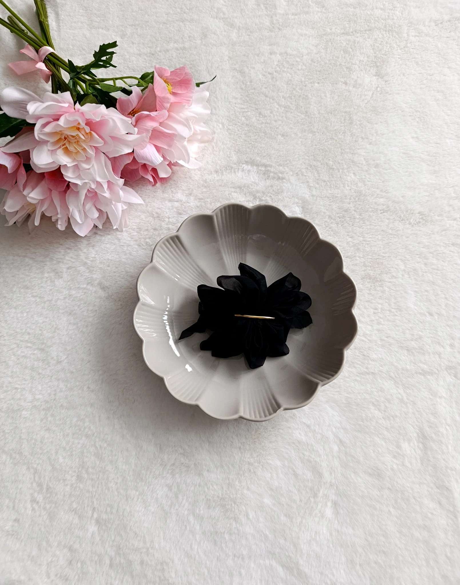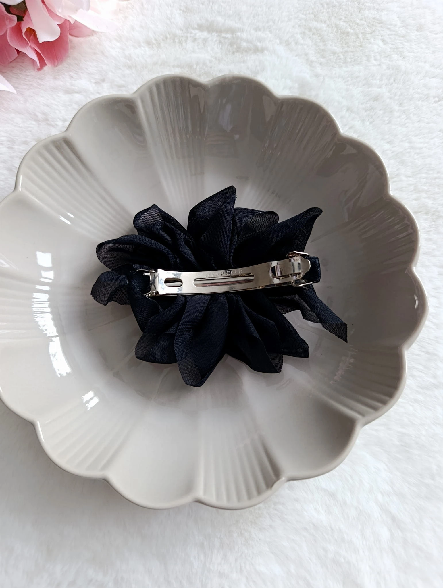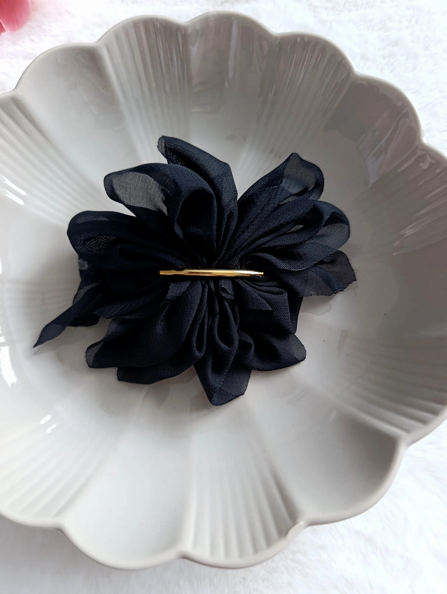 Model wykonany z marszczonego, czarnego szyfonu prezentuje się lekko i kobieco, a jednocześnie bardzo szykownie. Całość dopełnia subtelny złoty akcent, który przełamuje klasyczną czerń i nadaje spince biżuteryjnego charakteru.