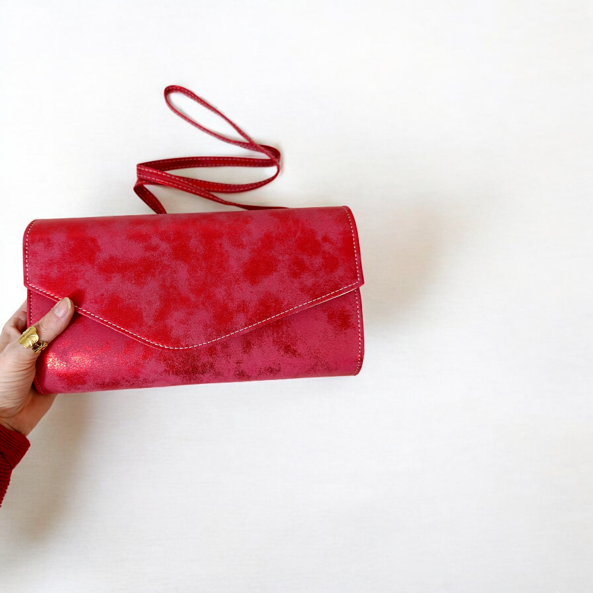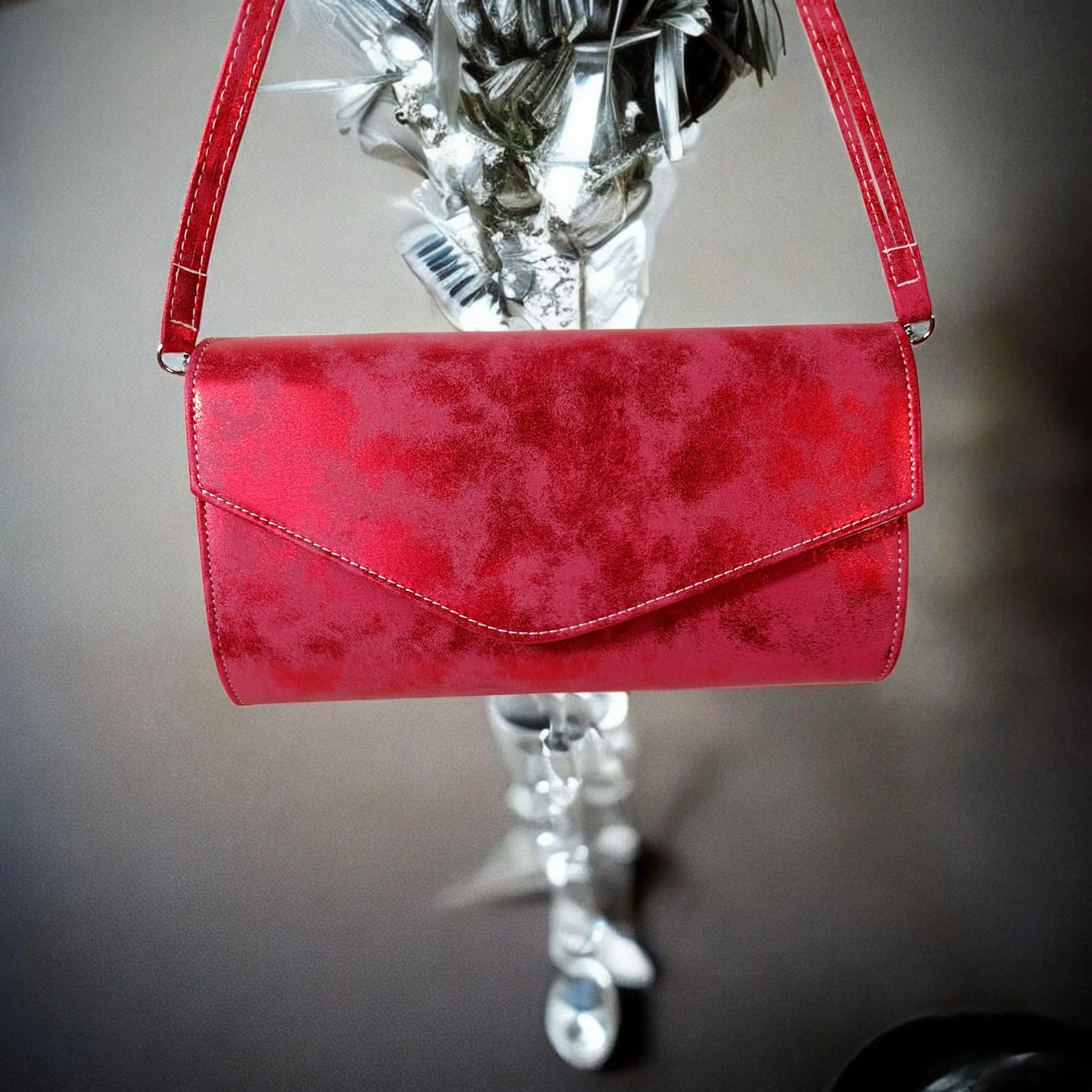 Ta wyjątkowa czerwona kopertówka wizytowa to idealne połączenie elegancji, praktyczności i ponadczasowego stylu. Wykonana z połyskliwej, delikatnie przecieranej powierzchni, pięknie odbija światło, dodając blasku każdej stylizacji - zarówno wieczorowej, jak i koktajlowej.