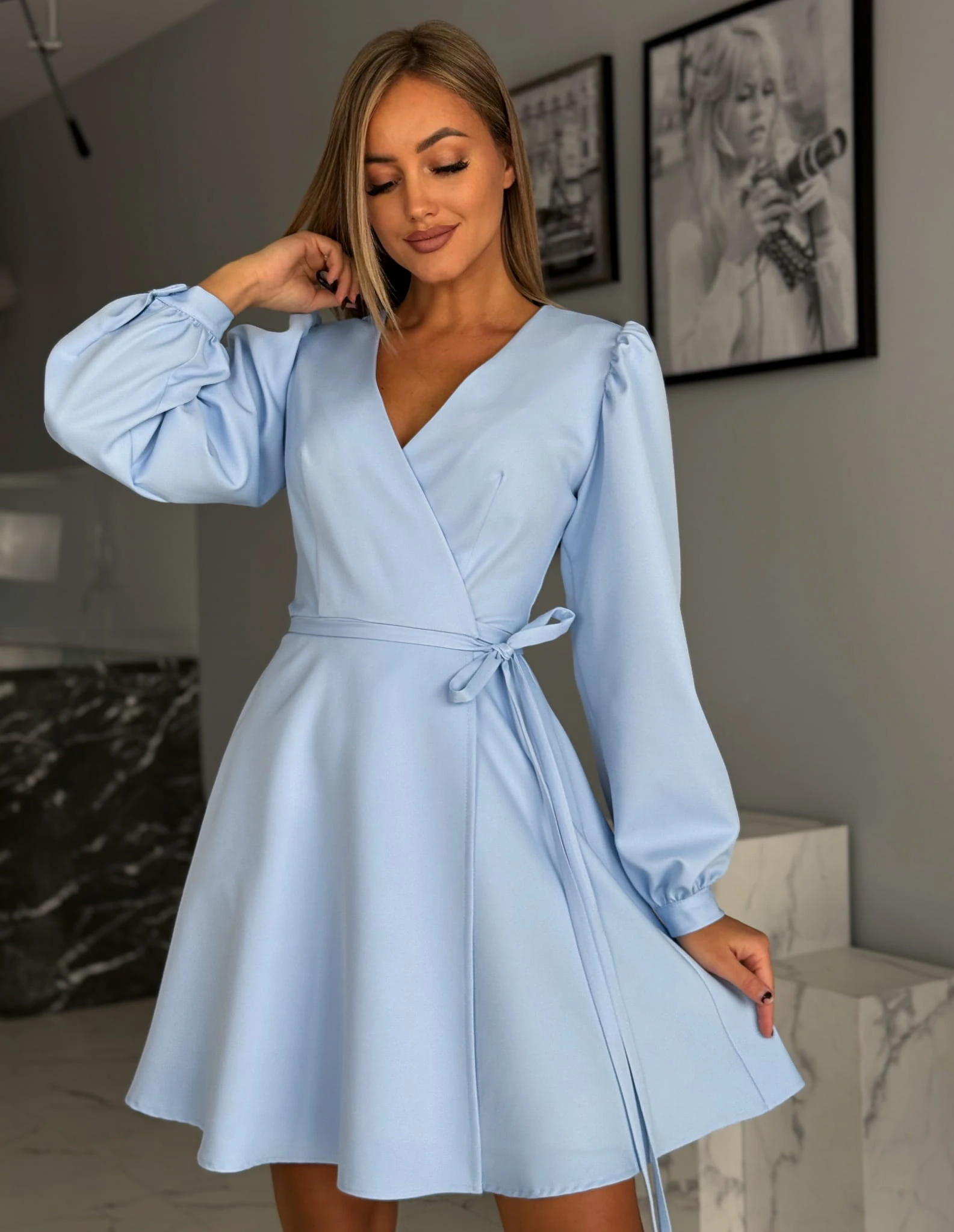 Elegancka sukienka w kolorze błękitnym, zaprojektowana z myślą o kobietach ceniących klasykę z nutą nowoczesności. Rozkloszowany krój typu dzwonek pięknie układa się w ruchu i podkreśla sylwetkę, a długość przed kolano nadaje jej lekkości i uniwersalnego charakteru - idealna zarówno na przyjęcia, jak i spotkania wizytowe.