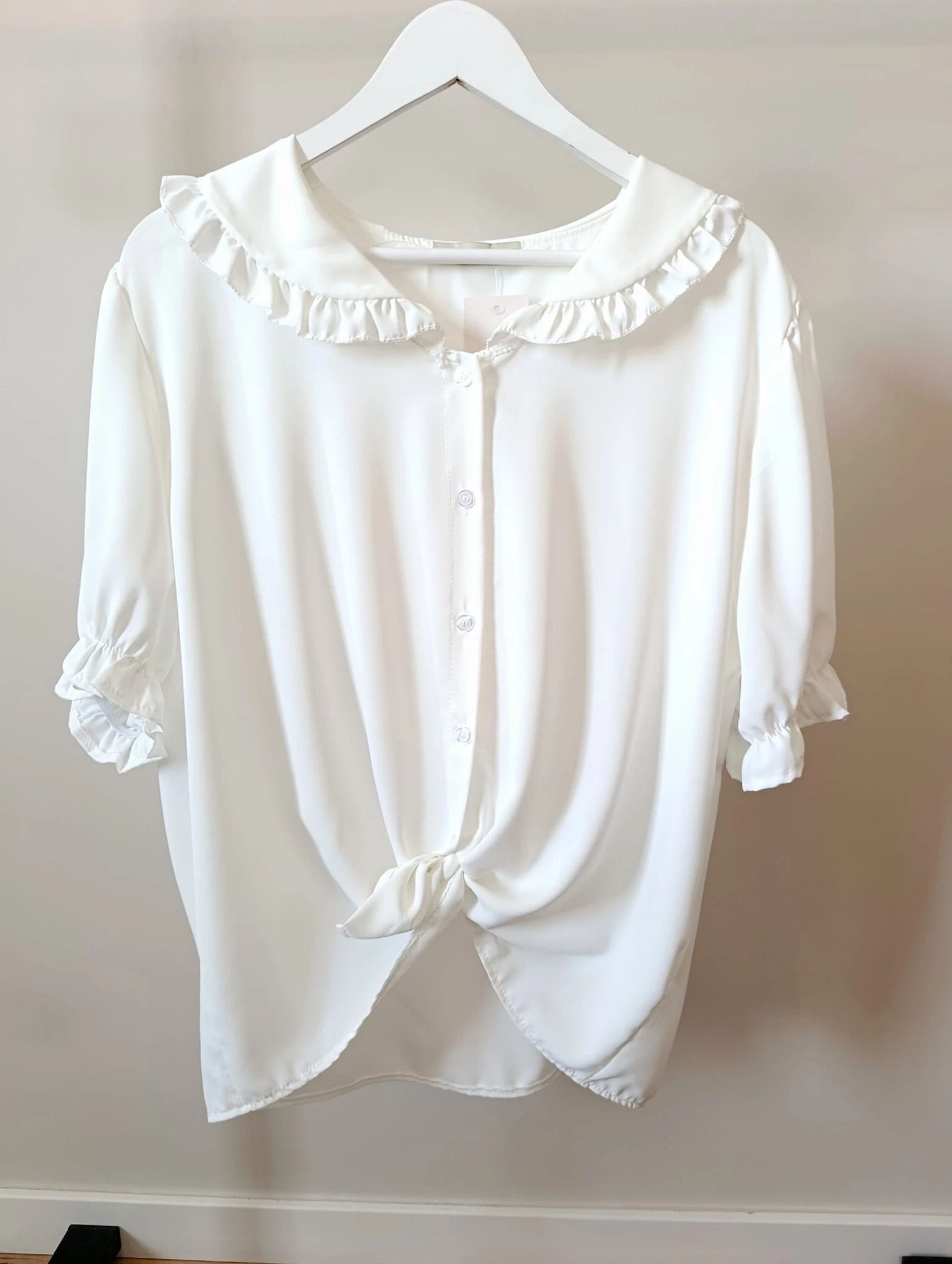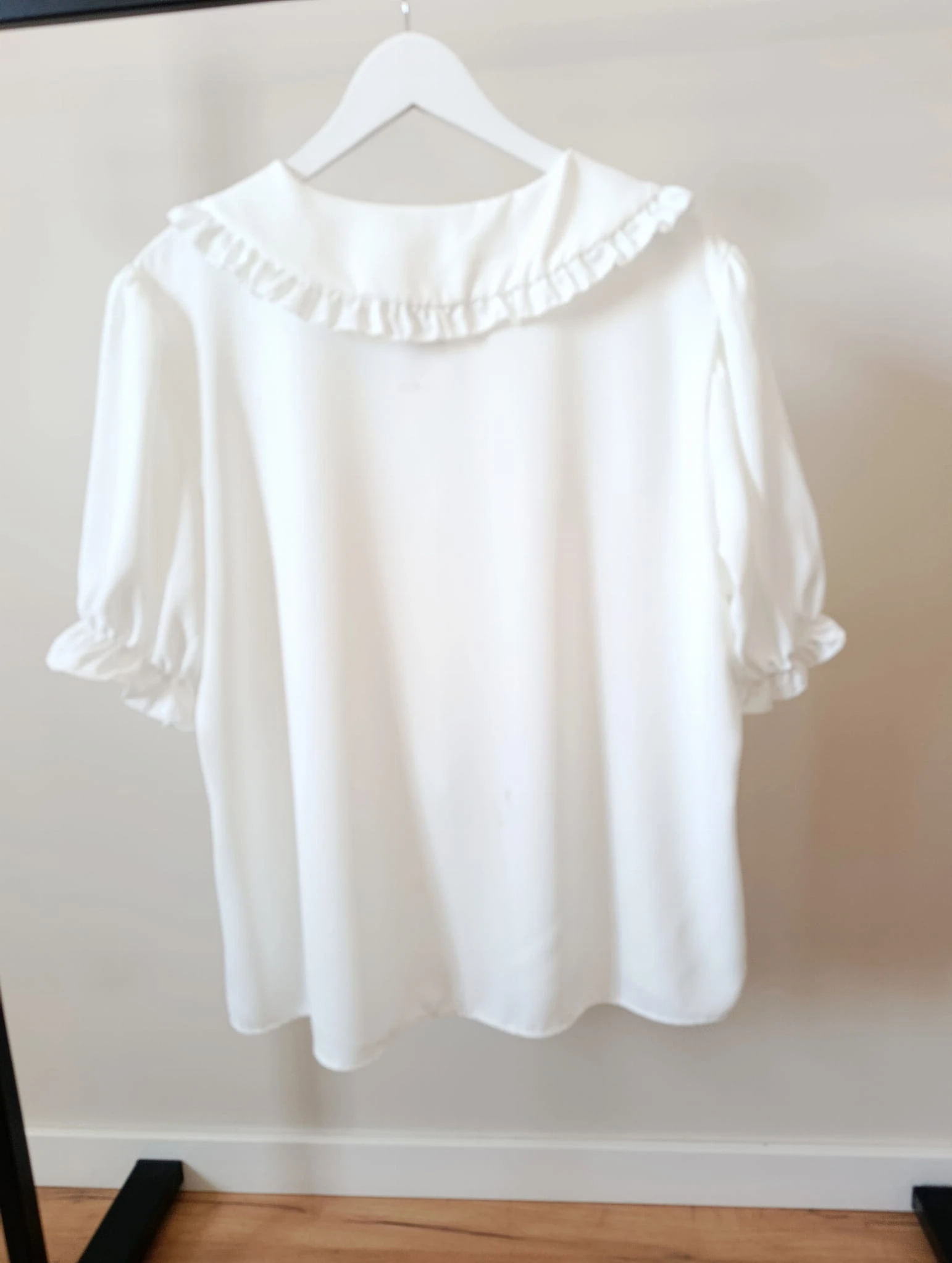 Biała koszula damska o lekkim, lejącym fasonie, wykonana z przyjemnej w dotyku wiskozy. Model zapinany na guziki, z kołnierzykiem bebe, który dodaje elegancji i uniwersalnego charakteru. Krótkie rękawy o wydłużonym kroju z delikatnym, bufiastym wykończeniem nadają całości subtelnej objętości i kobiecego uroku.