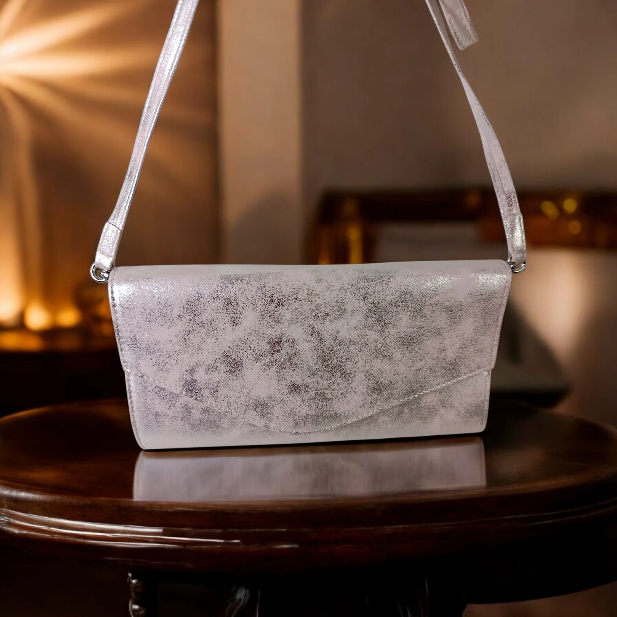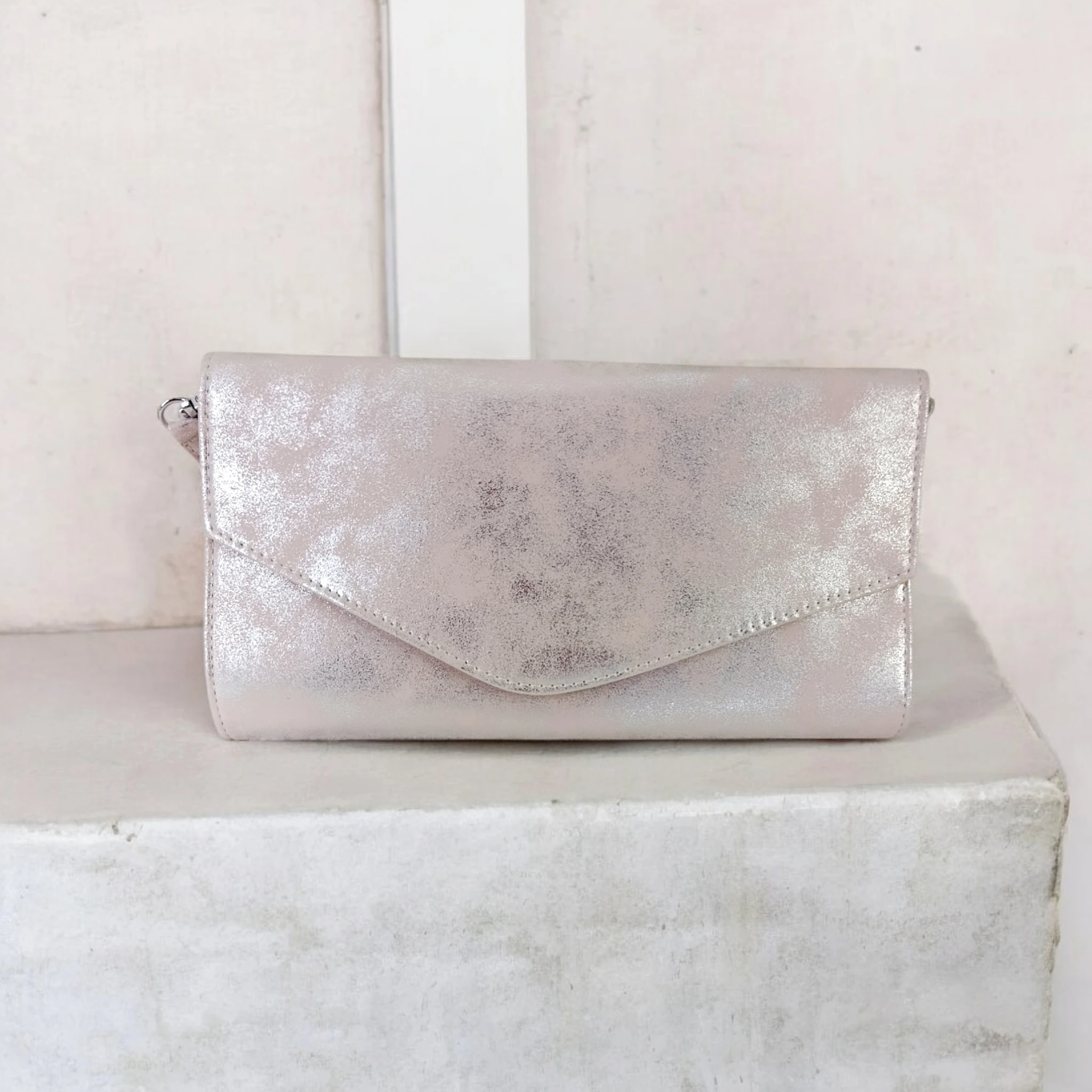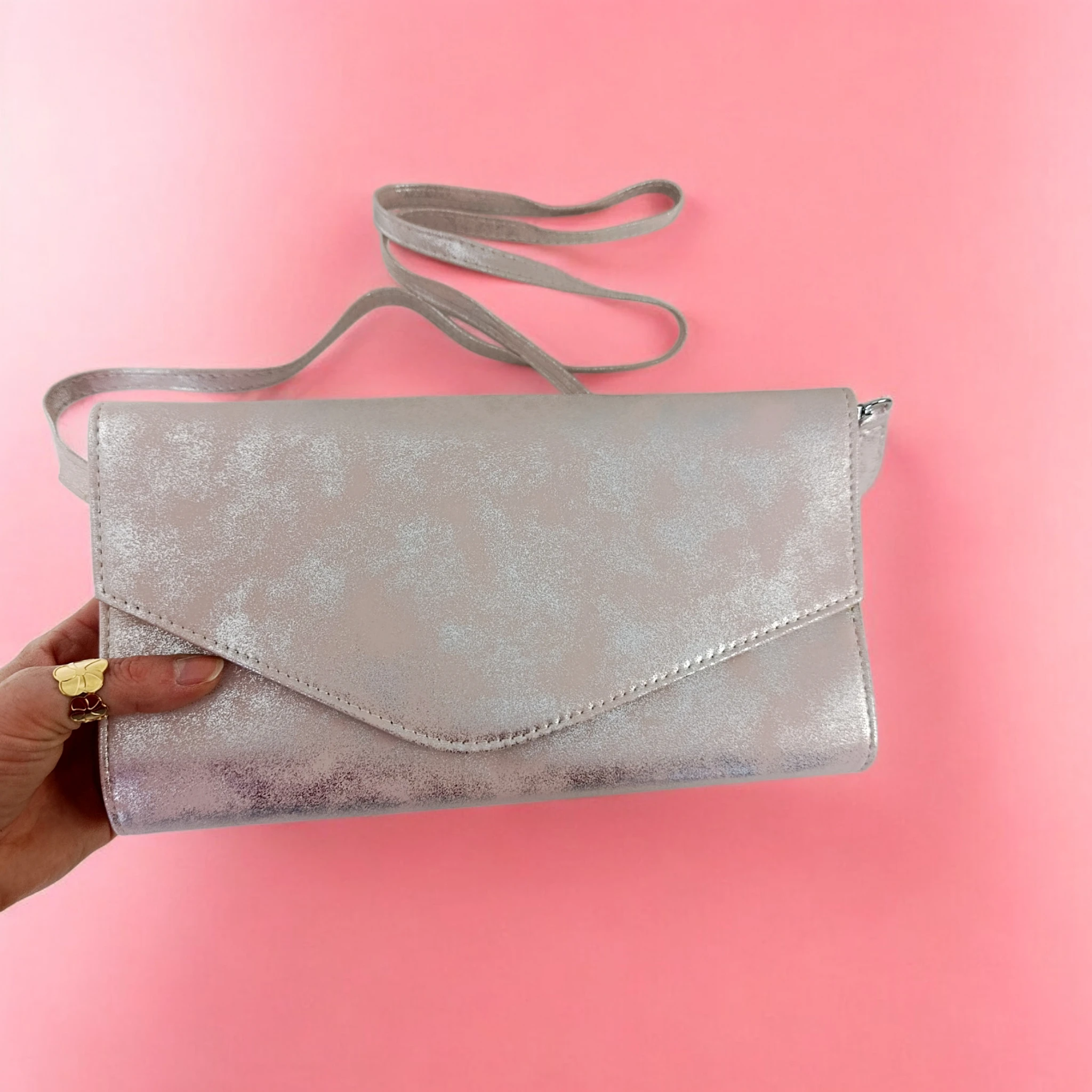 Ta wyjątkowa pudrowo-różowo- srebrna kopertówka wizytowa to idealne połączenie elegancji, praktyczności i ponadczasowego stylu. Wykonana z połyskliwej, delikatnie przecieranej powierzchni, pięknie odbija światło, dodając blasku każdej stylizacji - zarówno wieczorowej, jak i koktajlowej.