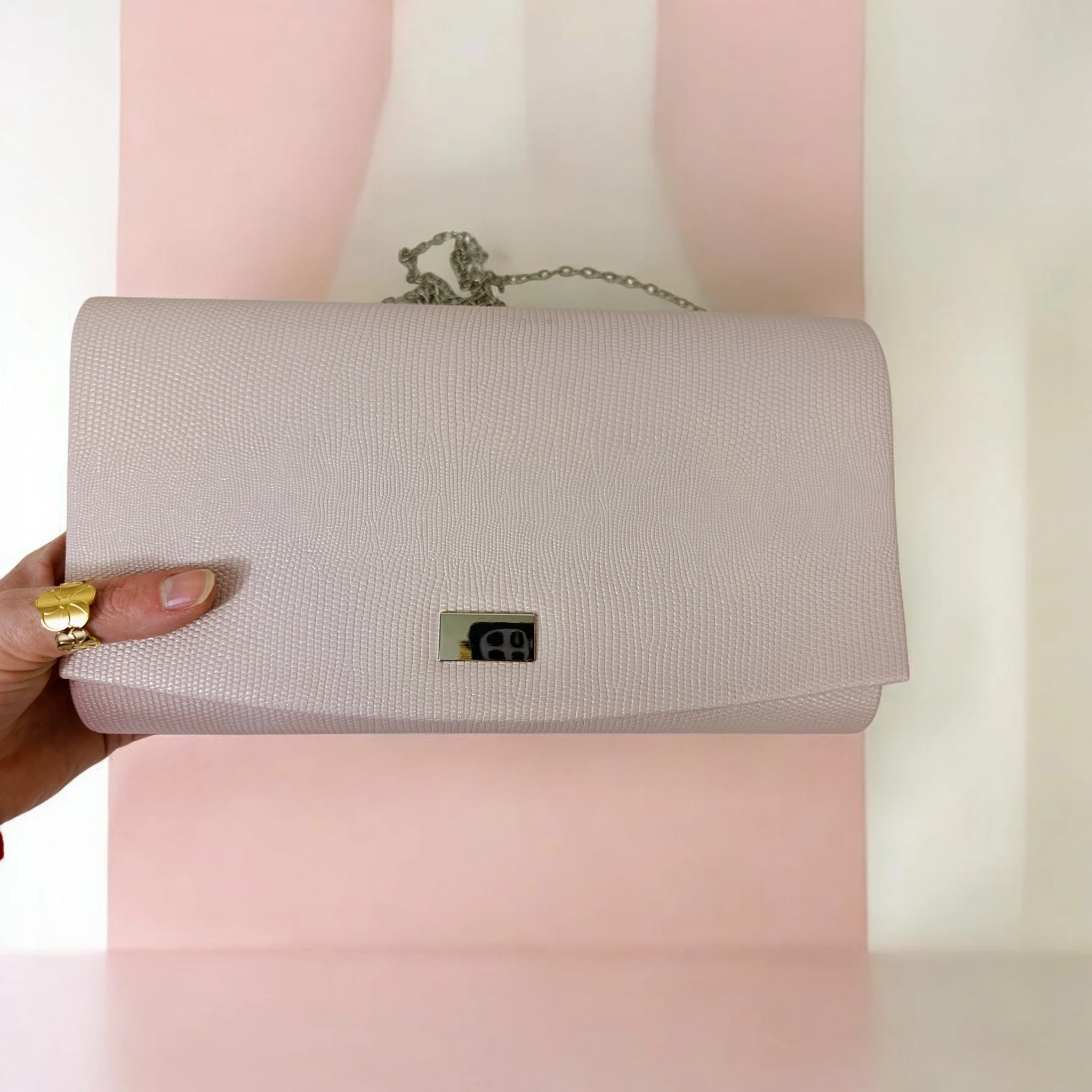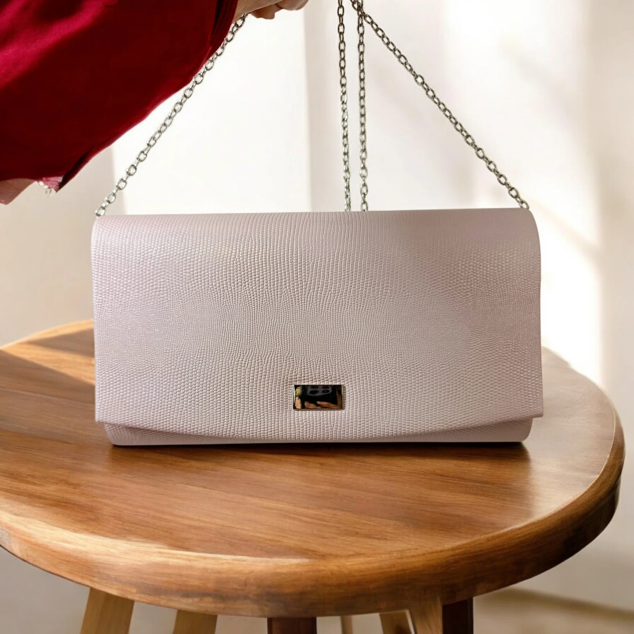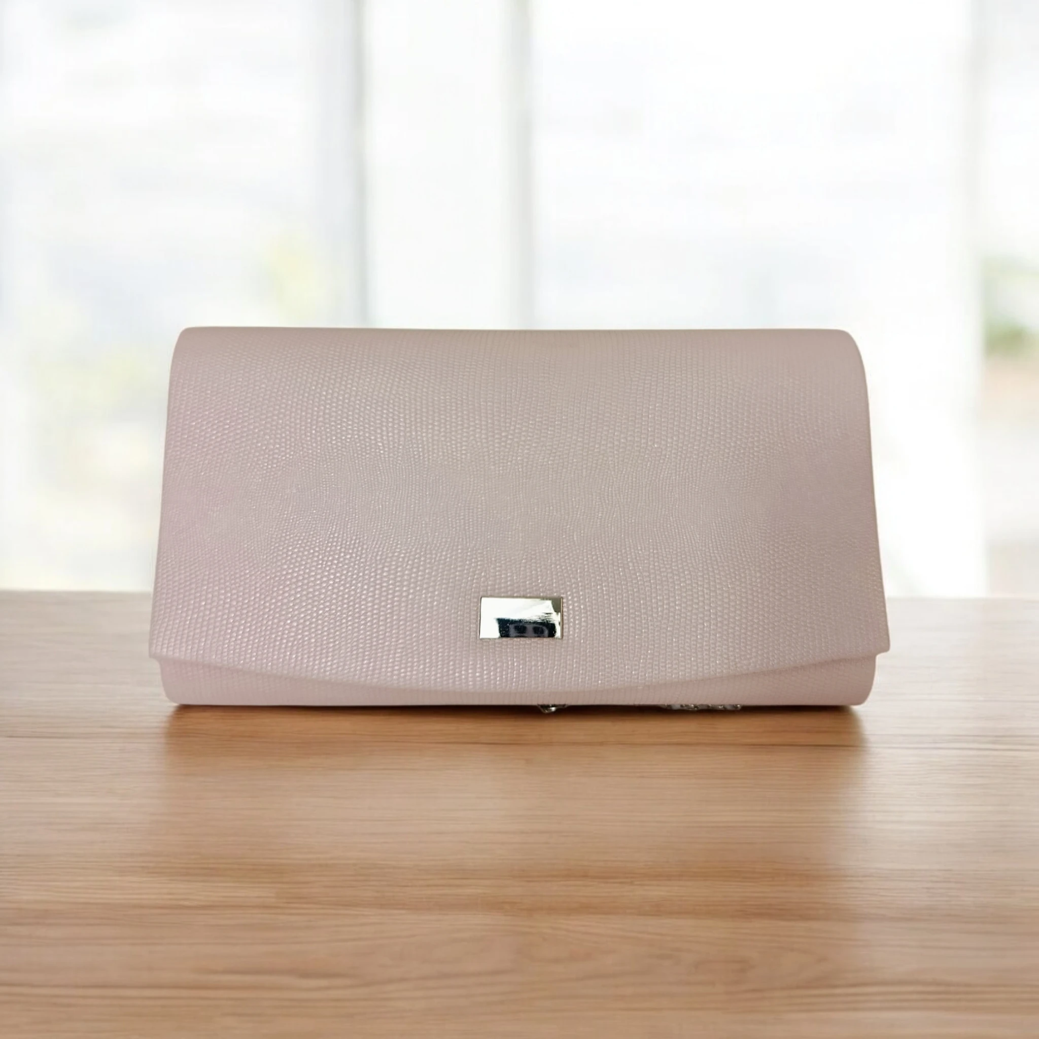 Zachwyć wszystkich subtelnym blaskiem i ponadczasowością elegancją. Ta elegancka kopertówka w kolorze pudrowego różu to coś więcej niż torebka - to dopełnienie Twojego stylu, Twojej pewności siebie i Twojego wyjątkowego wieczoru.