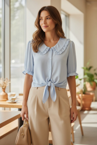 Błękitna koszula damska o lekkim, lejącym fasonie, wykonana z przyjemnej w dotyku wiskozy. Model zapinany na guziki, z kołnierzykiem bebe, który dodaje elegancji i uniwersalnego charakteru. Krótkie rękawy o wydłużonym kroju z delikatnym, bufiastym wykończeniem nadają całości subtelnej objętości i kobiecego uroku.