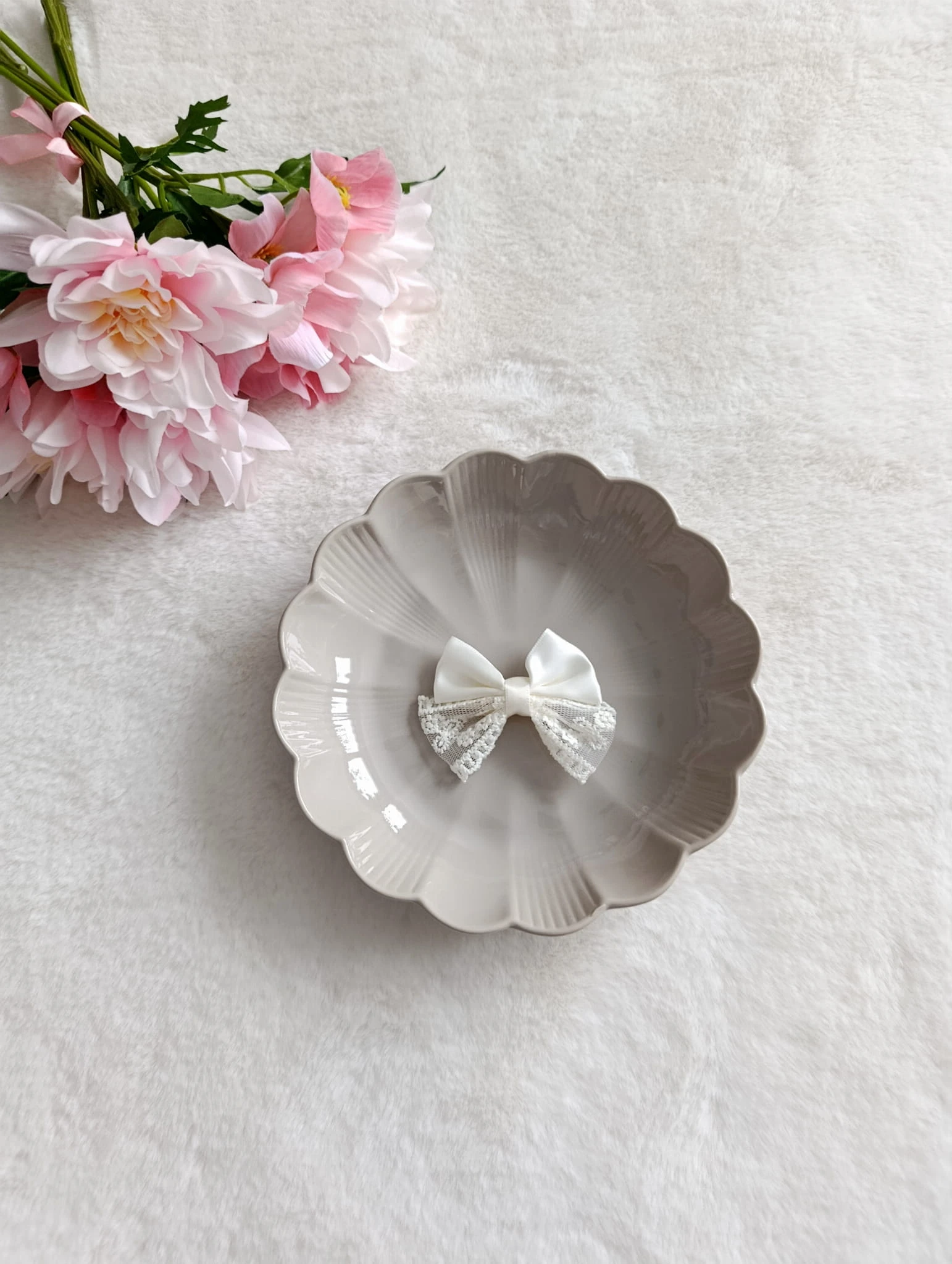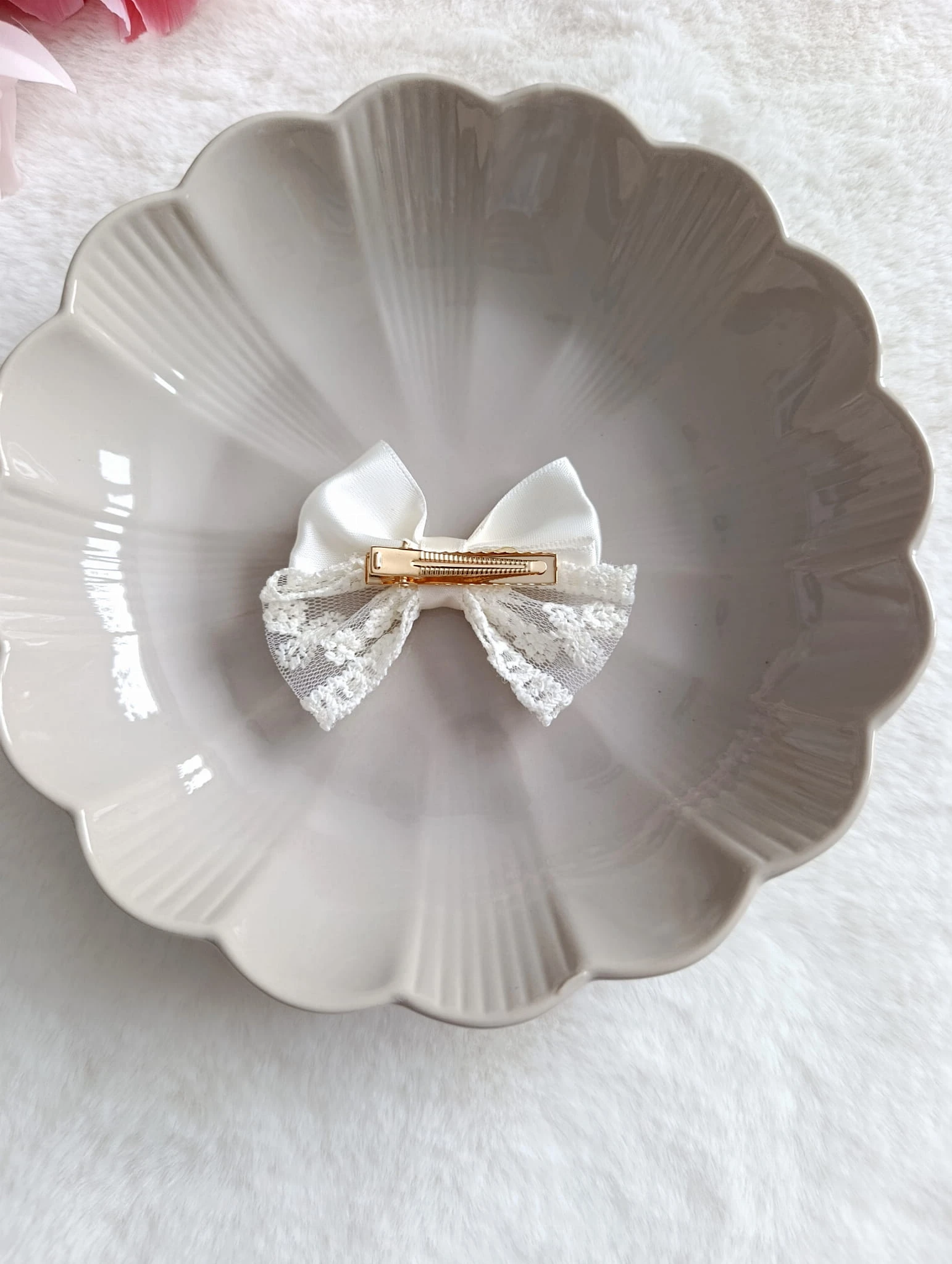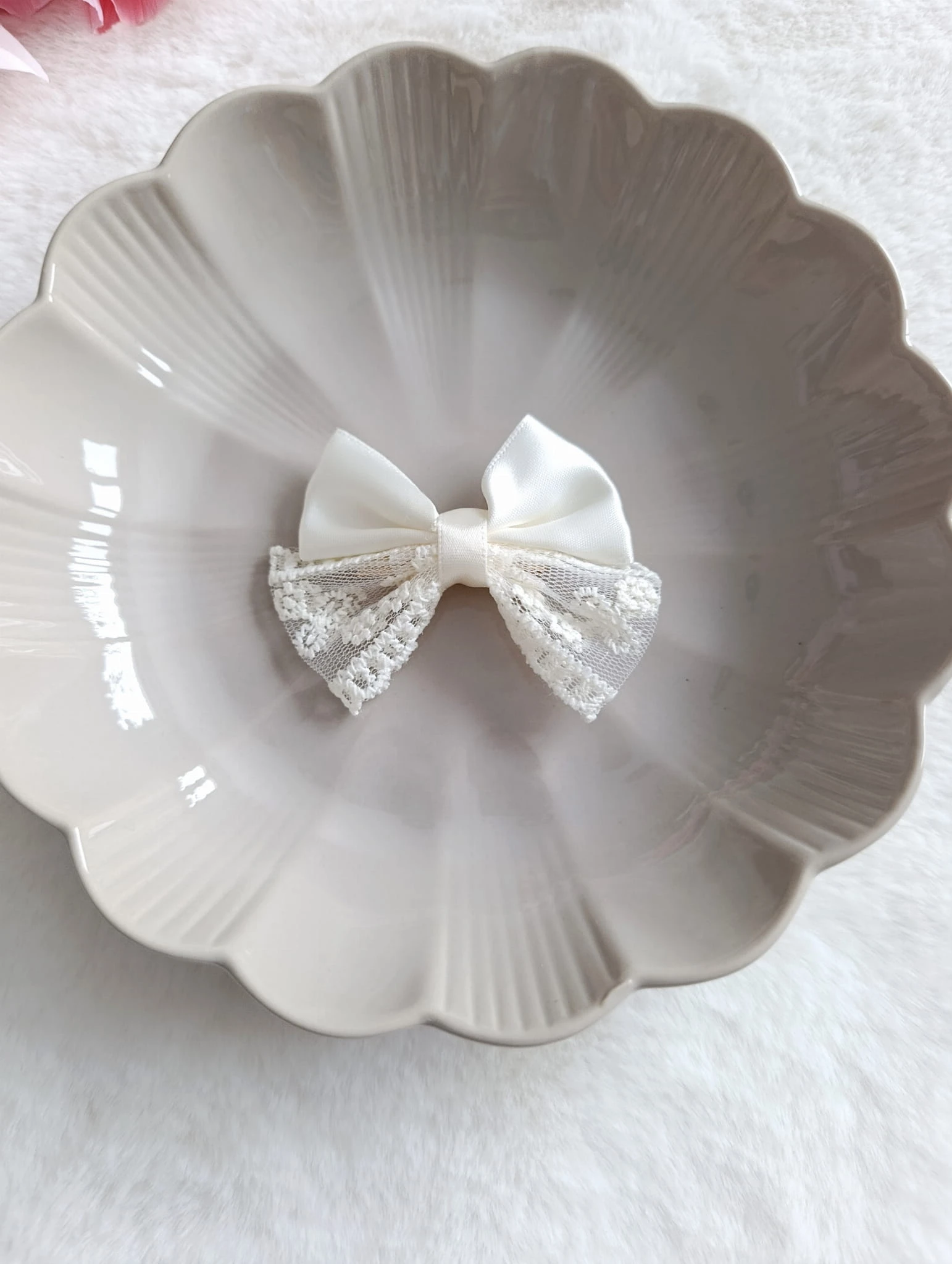 Elegancka spinka do włosów w kolorze ecru, wykonana z gładkiej satyny połączonej z delikatną koronką, uformowana w subtelną kokardę. Lekka i romantyczna, pięknie dopełnia fryzurę, dodając stylizacji delikatności i klasy - idealna na uroczystości oraz wyjątkowe okazje.