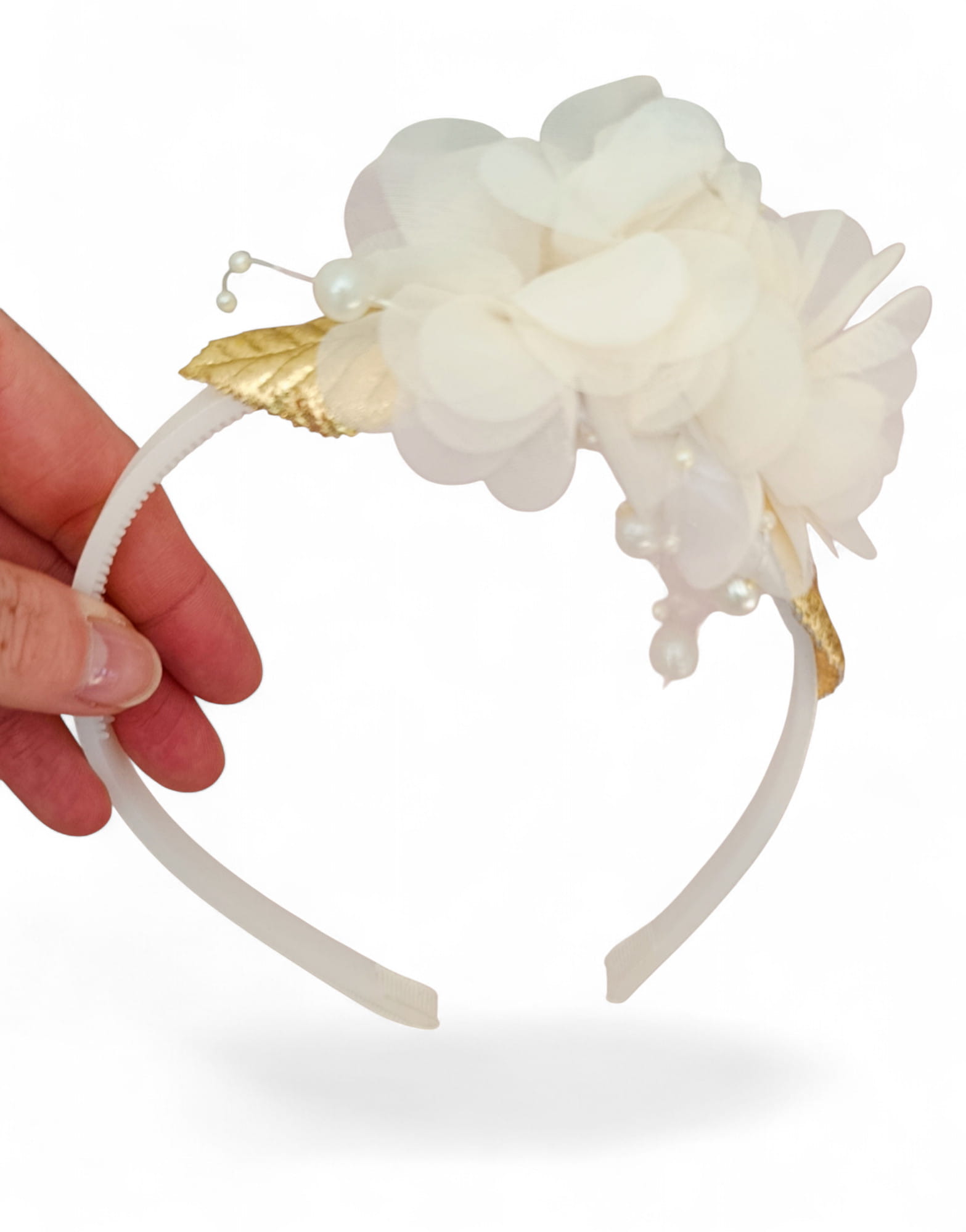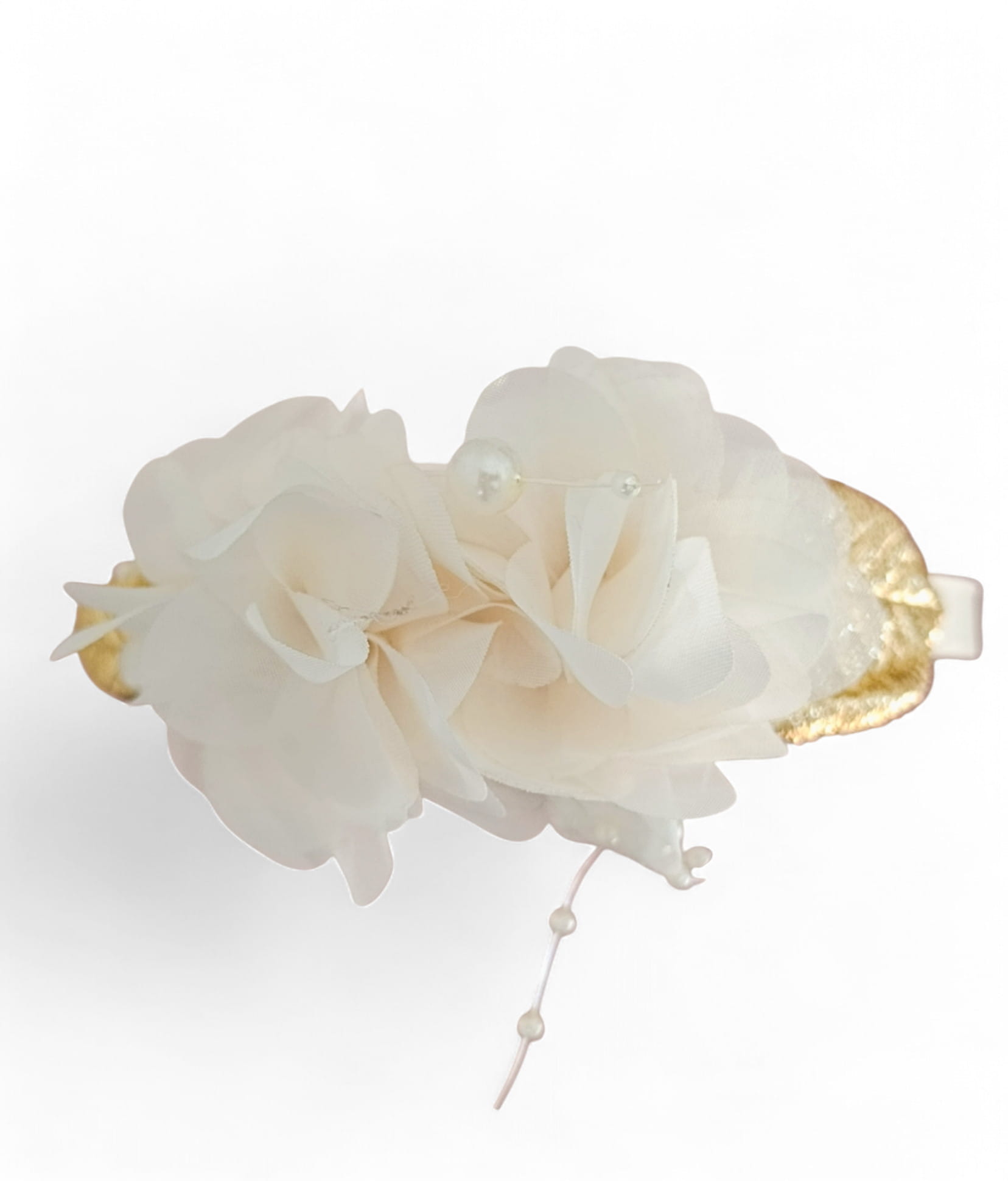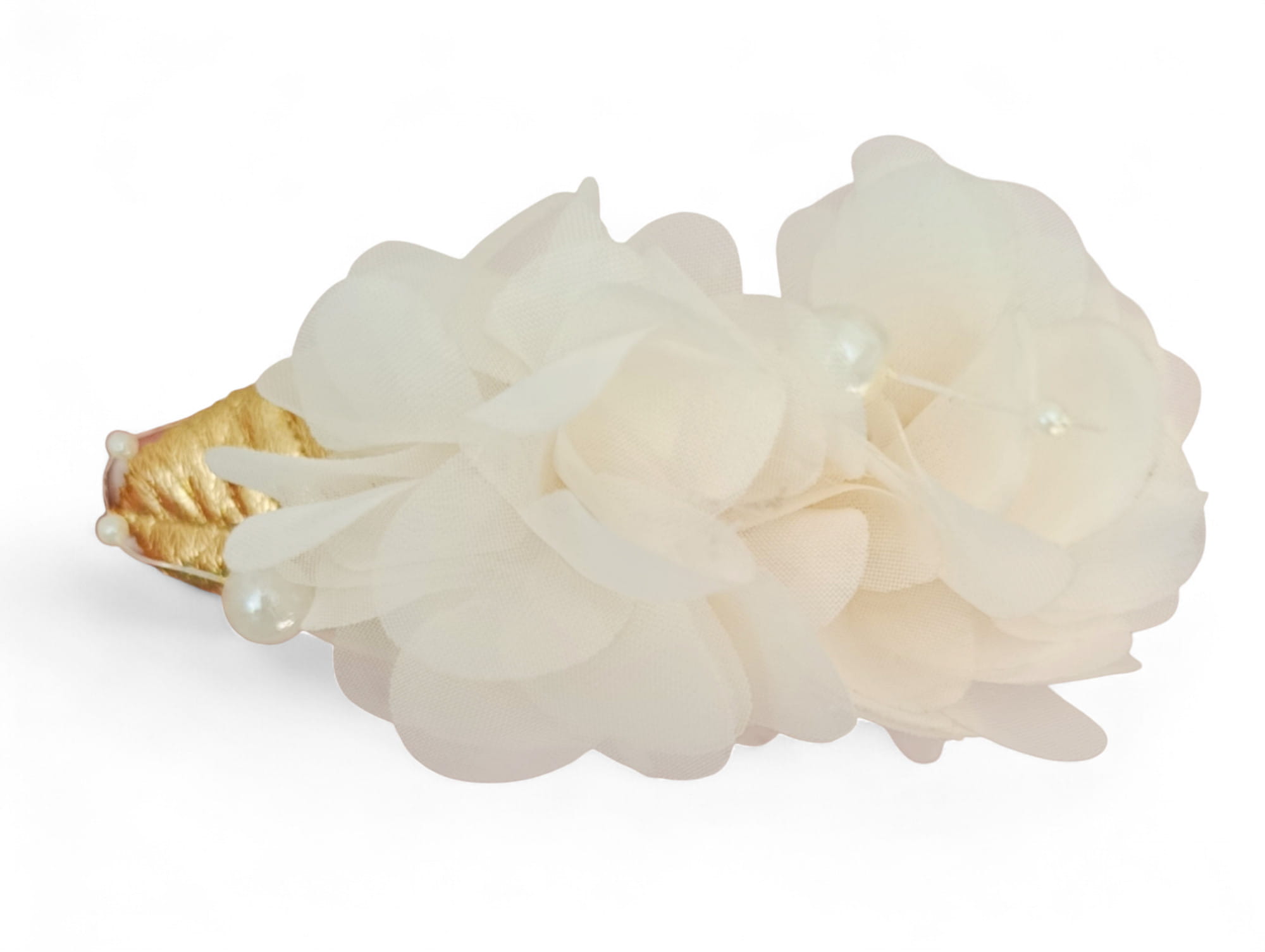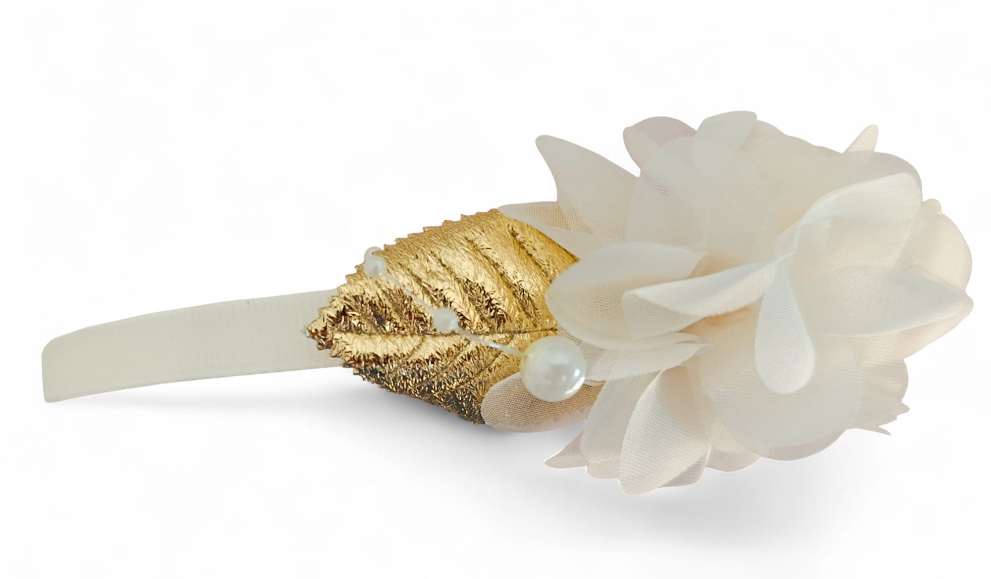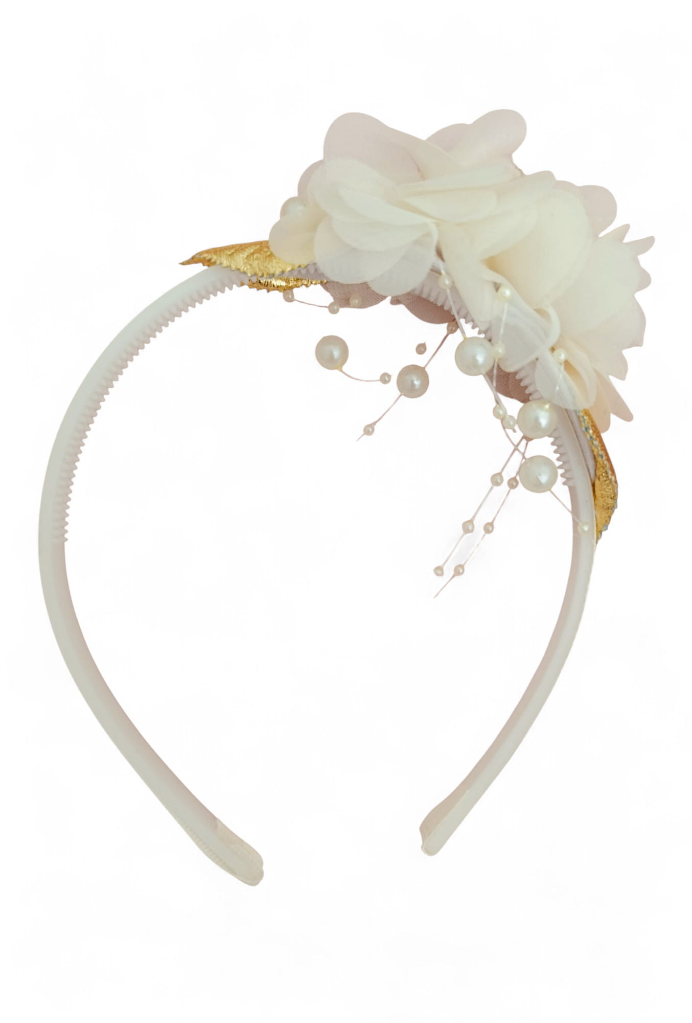 Ta wyjątkowa opaska to elegancki dodatek, który zachwyci swoim wyglądem. Ozdobiona pięknymi kremowymi kwiatami, subtelnym fascynatorem i delikatnymi koralikami, tworzy niezwykle efektowną całość.