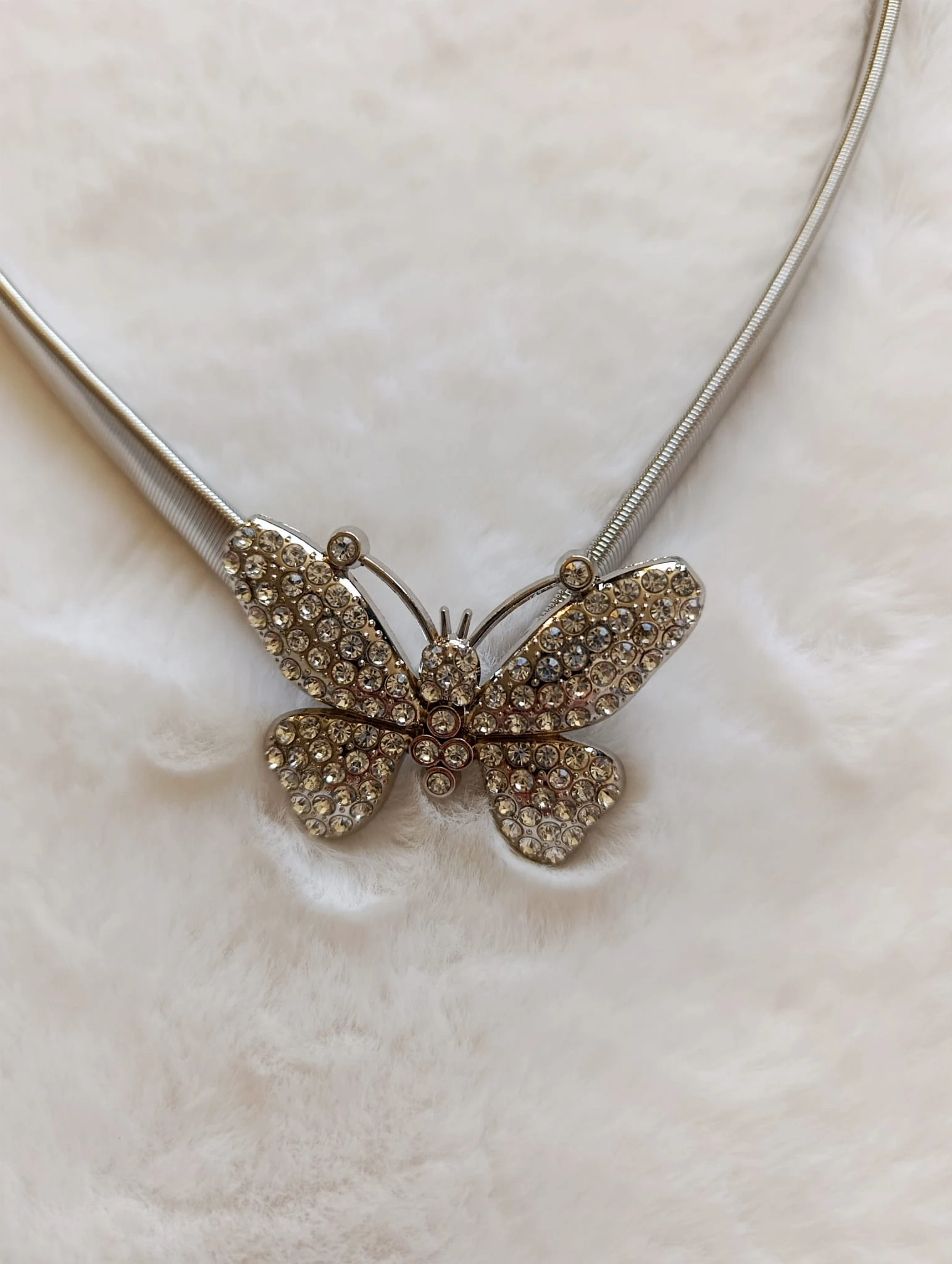 - dekoracja: ozdobna klamra w kształcie motyla z cyrkoniami