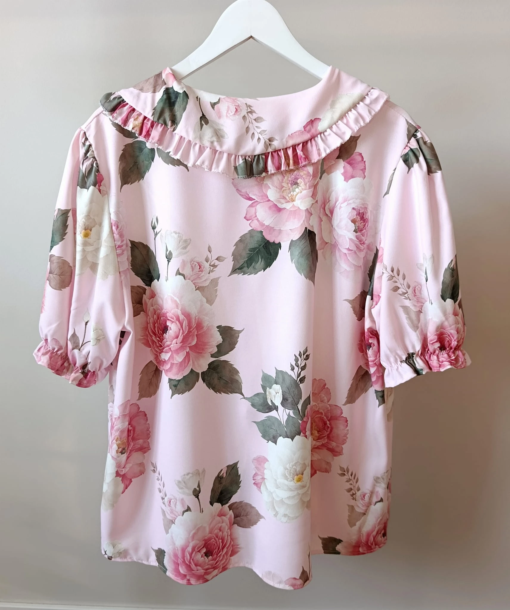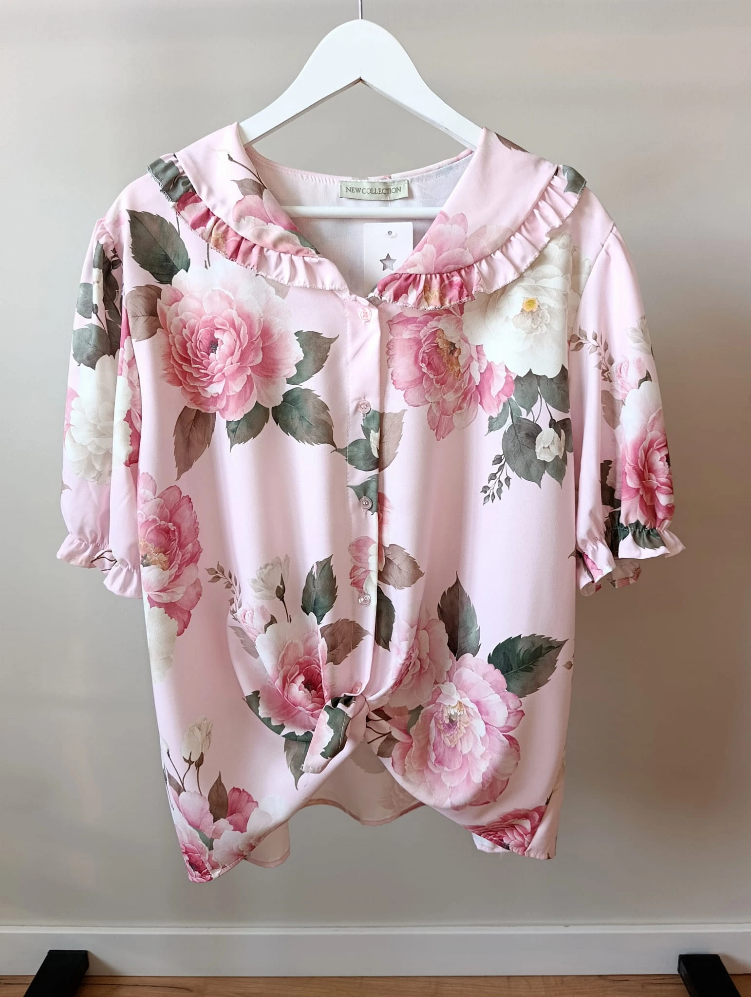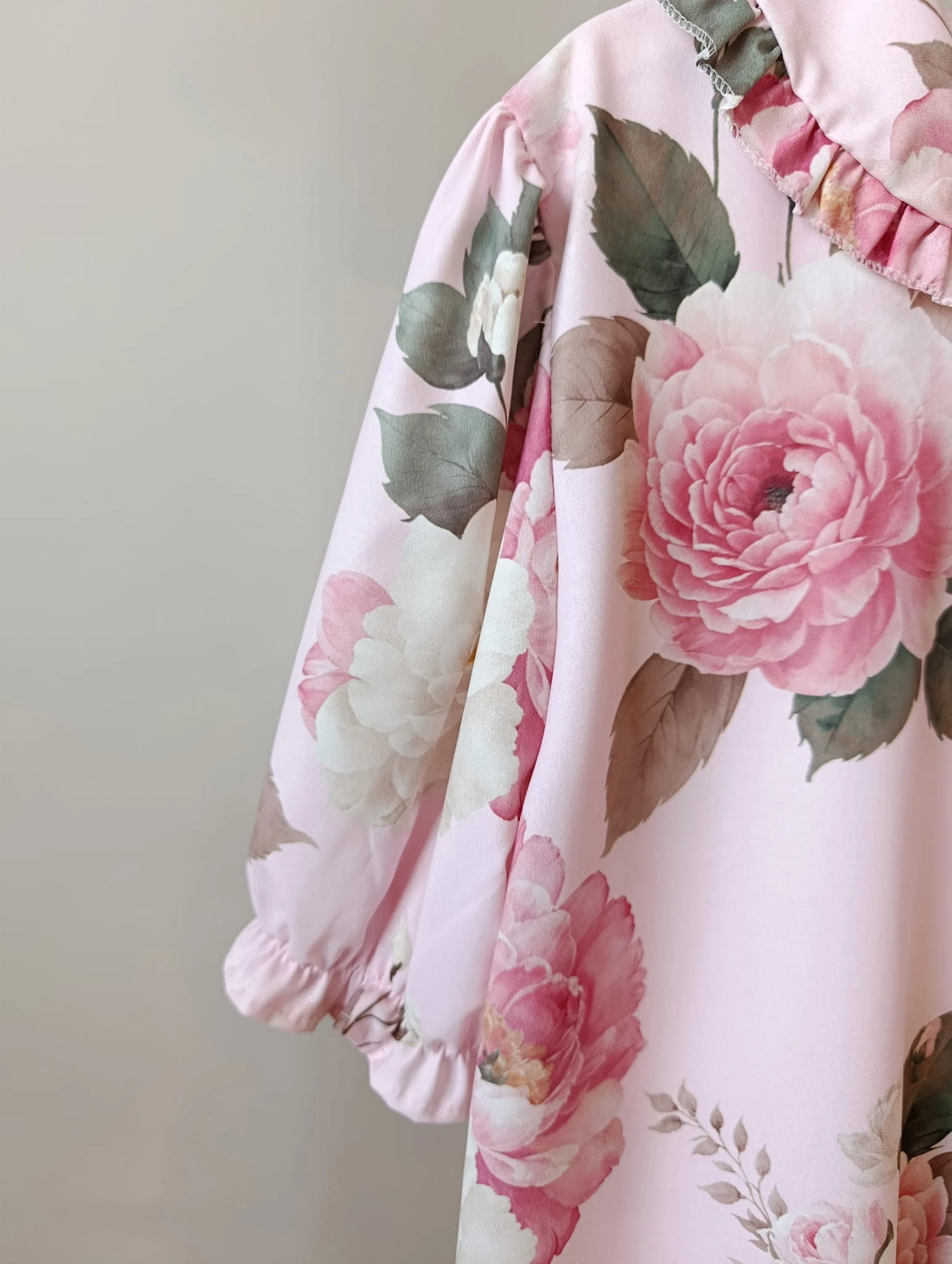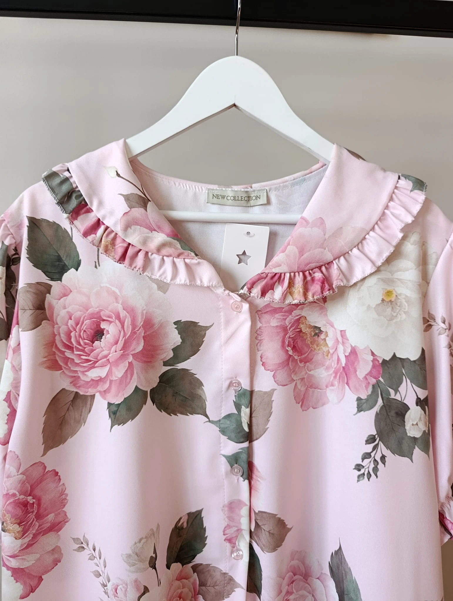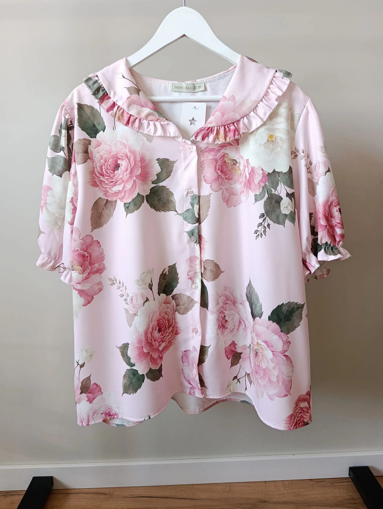 Stylowa i kobieca koszula w różowym kolorze, ozdobiona delikatnym, kwiatowym wzorem. Model wyróżnia się uroczym kołnierzykiem typu bebe, który dodaje całości subtelnego, romantycznego charakteru.