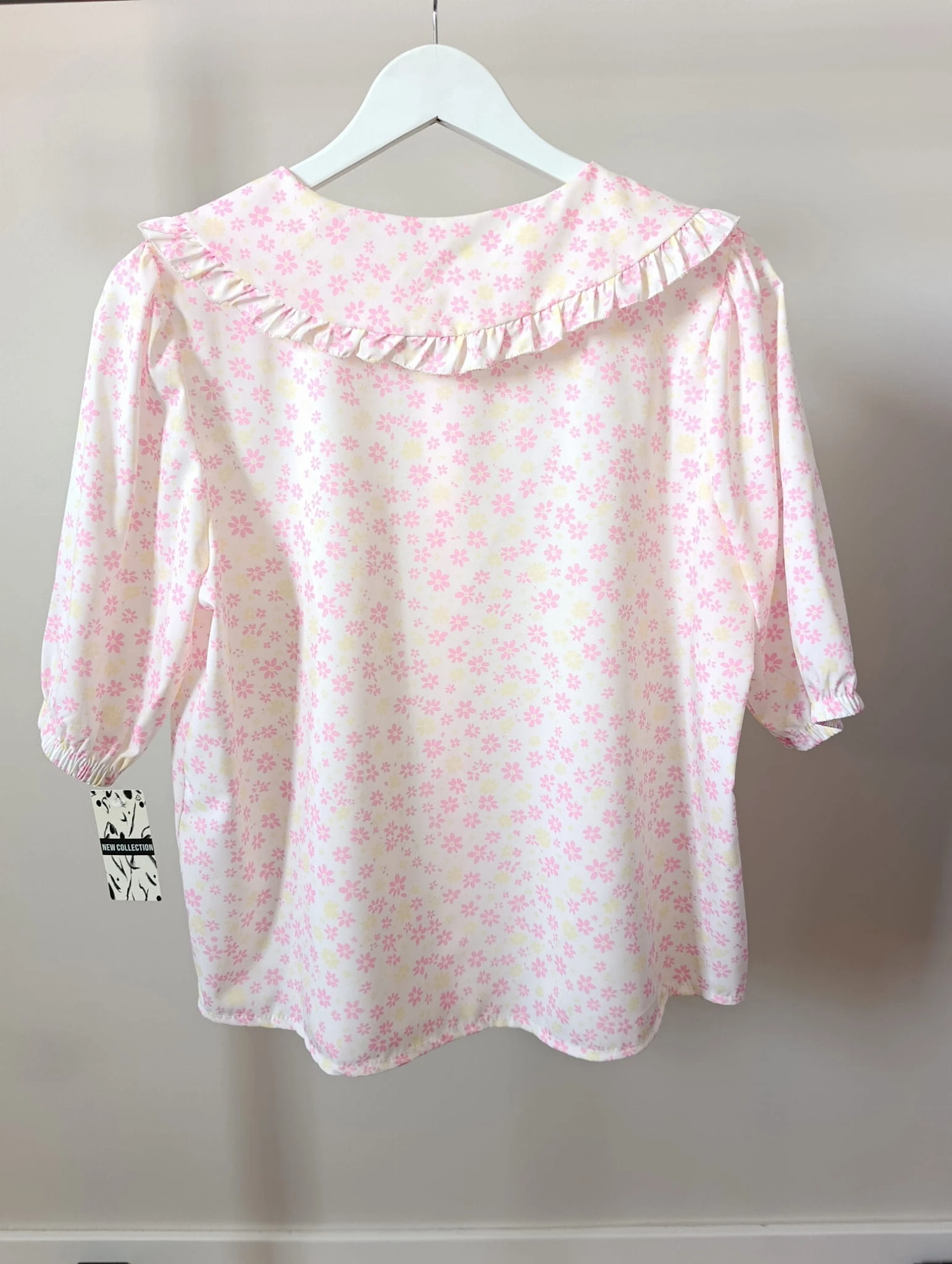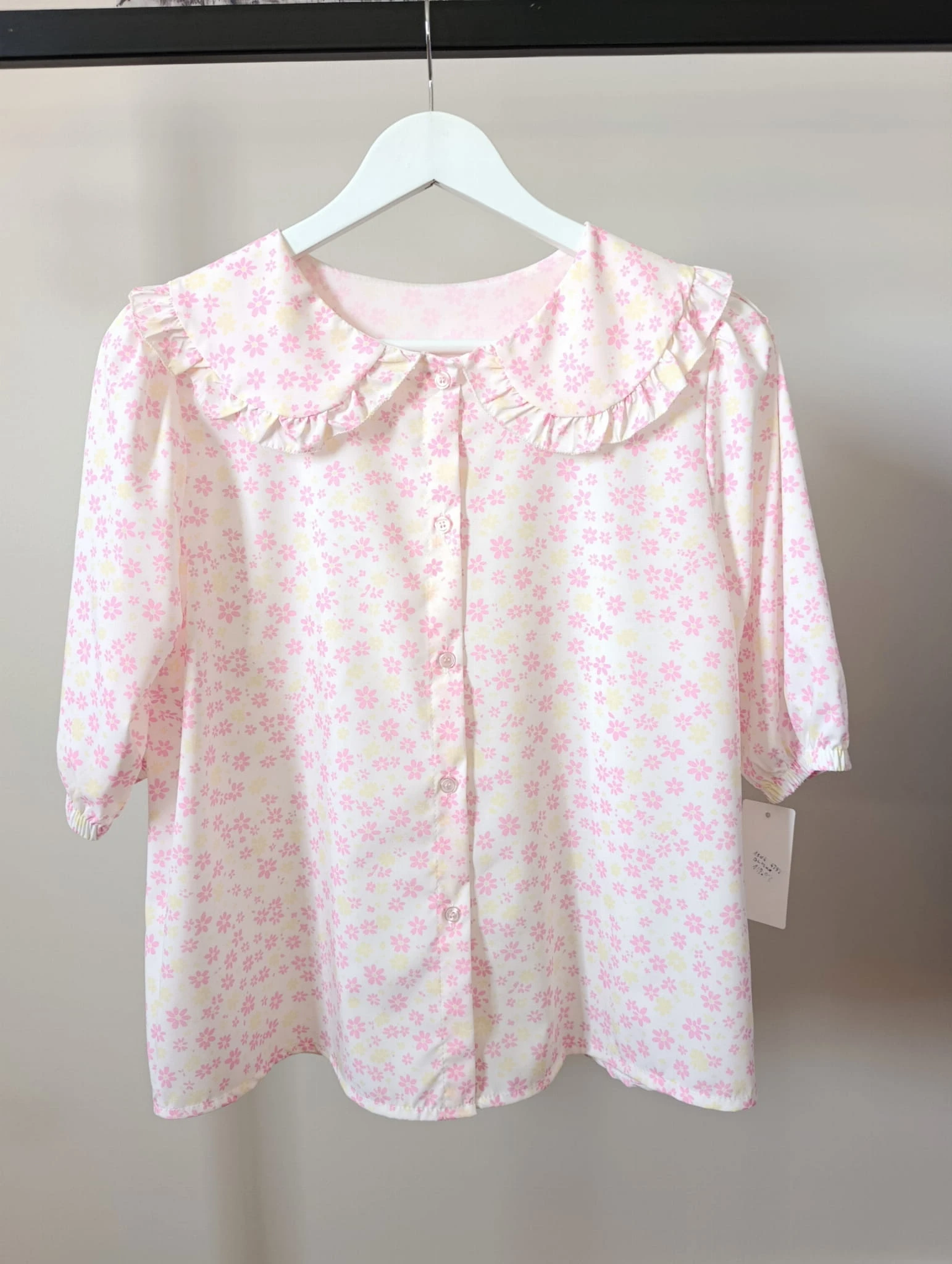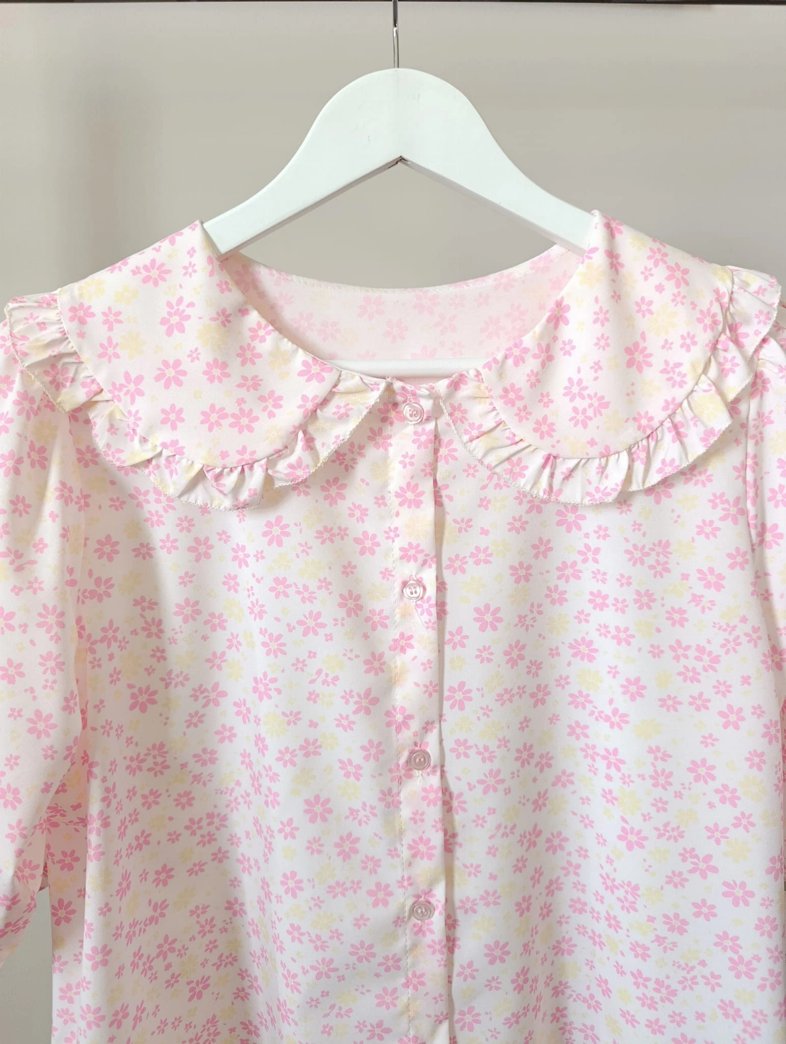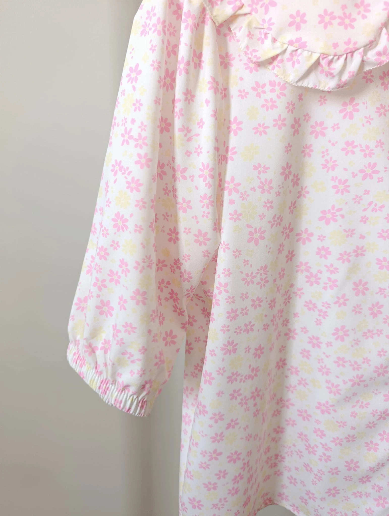 Elegancka, a zarazem lekka i dziewczęca koszula damska w kolorze białym, zapinana na guziki. Wyróżnia się ozdobnym kołnierzykiem, który dodaje jej subtelnego uroku i wyjątkowego charakteru, Całość zdobi delikatny print w drobne kwiatki w odcieniach różu i żółci, nadający koszuli świeżości oraz romantycznego stylu.