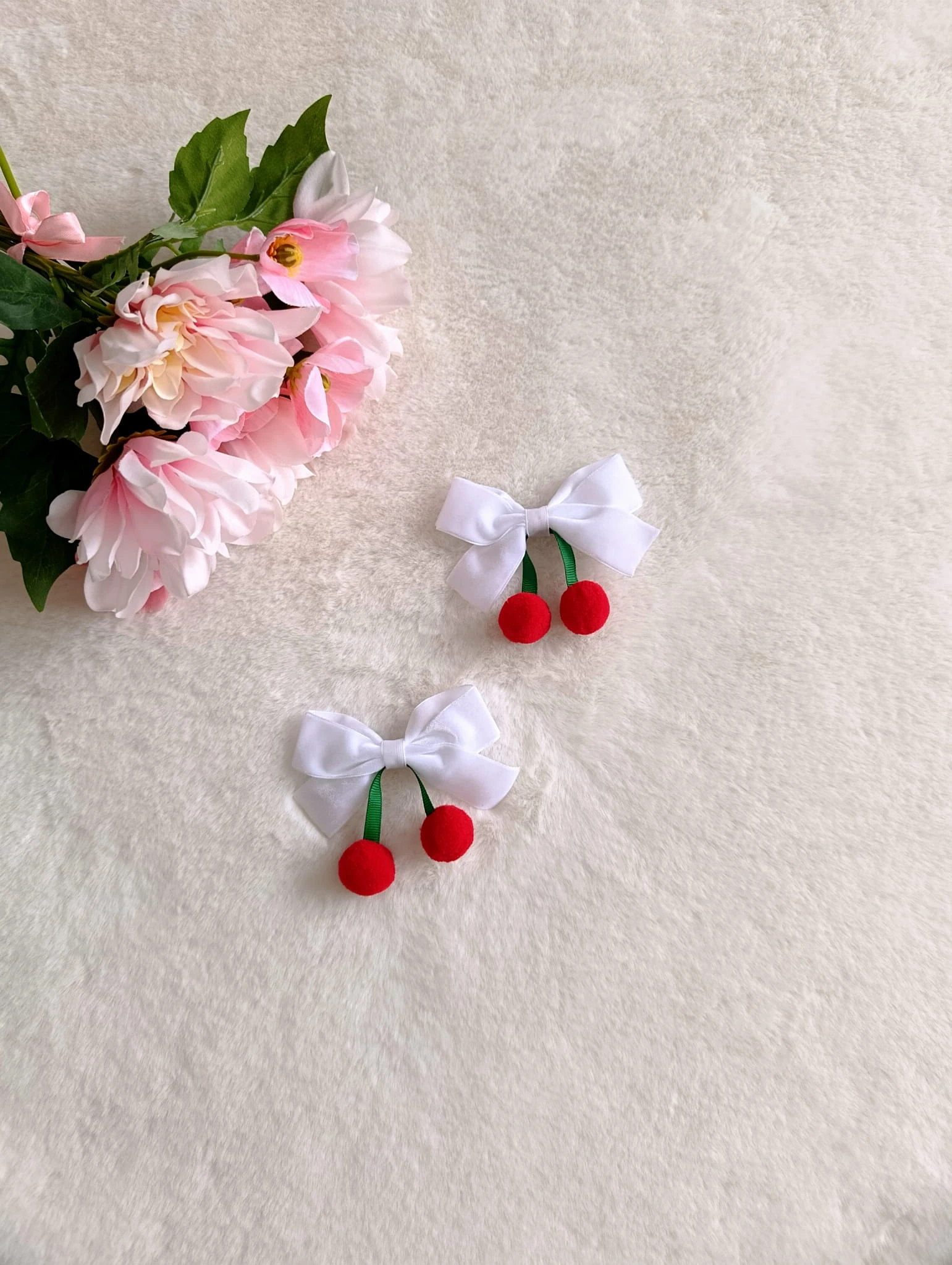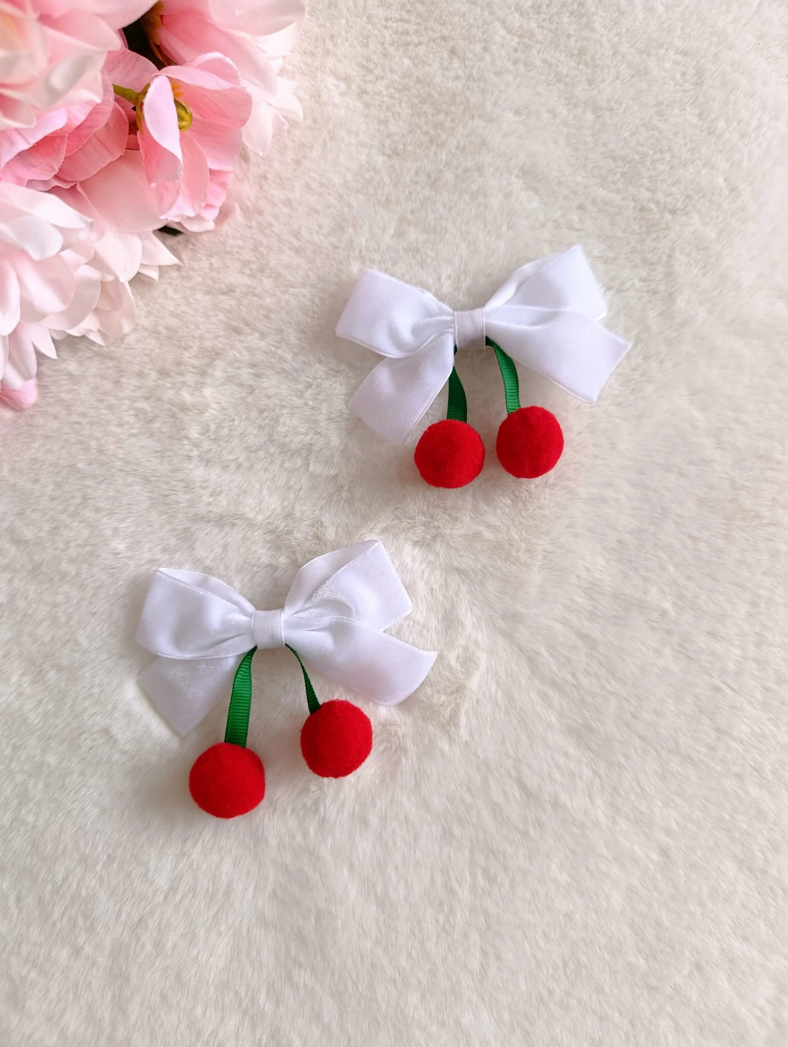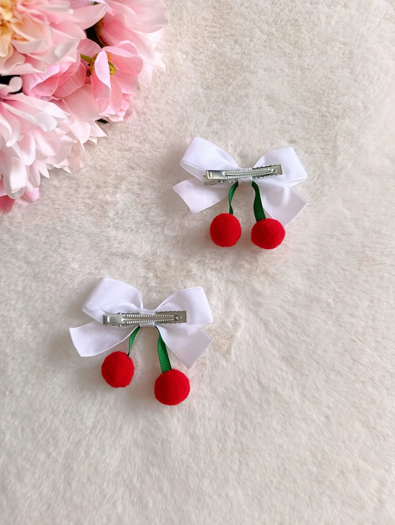 Z kokardy zwisają dwa czerwone pomponiki, które tworzą efekt słodkich wiśni i dodają całości lekkości oraz uroku. Starannie wykonana ozdoba doskonale utrzymuje włosy, nie ciągnąc ich i zapewniając komfort noszenia przez cały dzień.