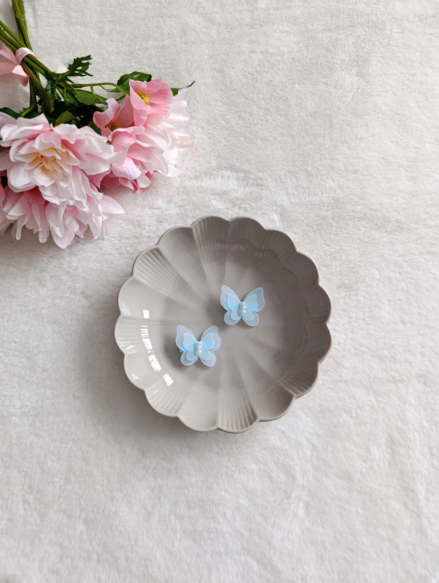 Motylek zachwyca subtelną formą i dziewczęcym urokiem, a jego środek zdobią trzy białe perełki, które pięknie odbijają światło i dodają całości lekkości oraz elegancji. To połączenie sprawia, że spinka wygląda bajkowo, ale wciąż jest delikatna i nieprzesadzona.
