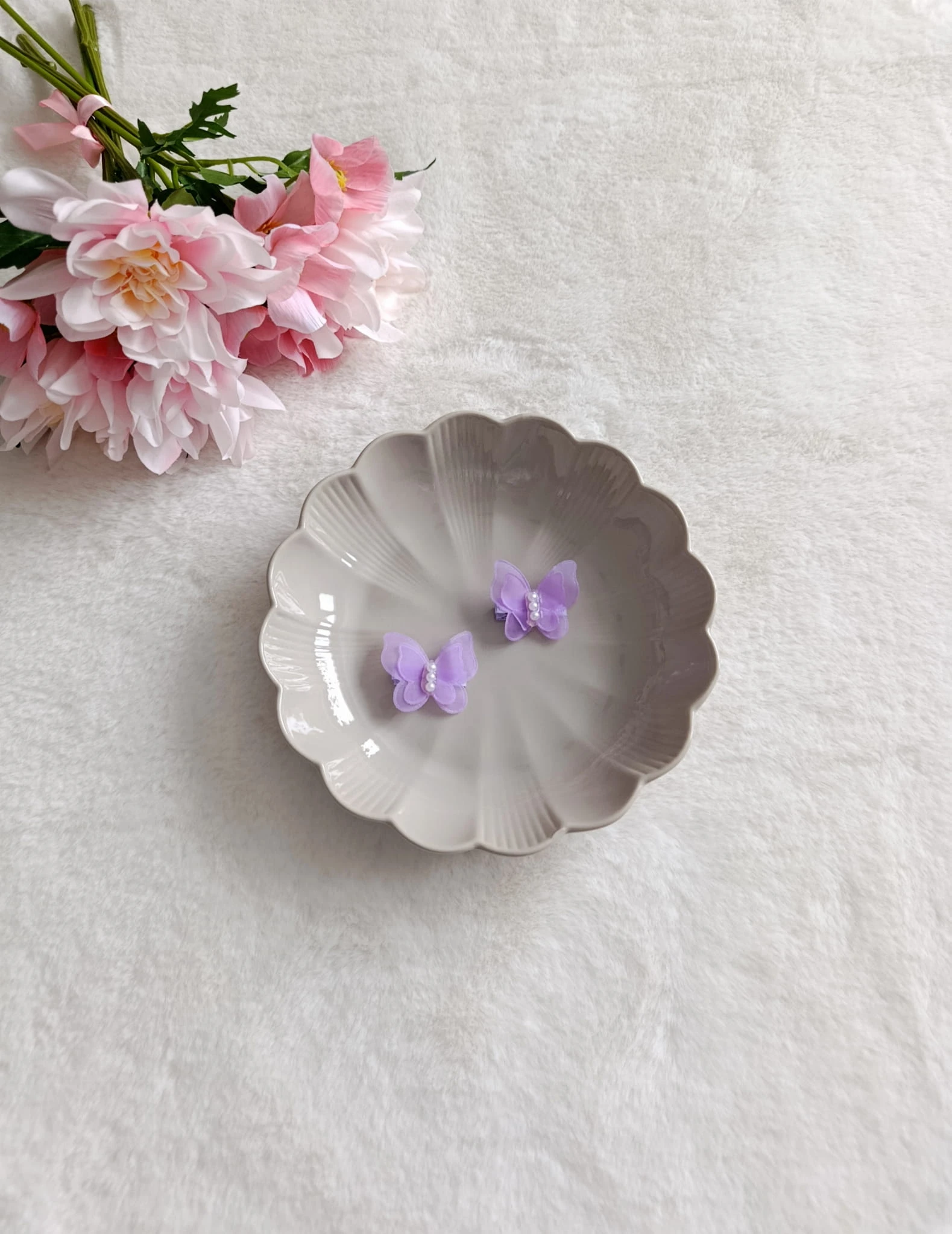 Motylek zachwyca subtelną formą i dziewczęcym urokiem, a jego środek zdobią trzy białe perełki, które pięknie odbijają światło i dodają całości lekkości oraz elegancji. To połączenie sprawia, że spinka wygląda bajkowo, ale wciąż jest delikatna i nieprzesadzona.