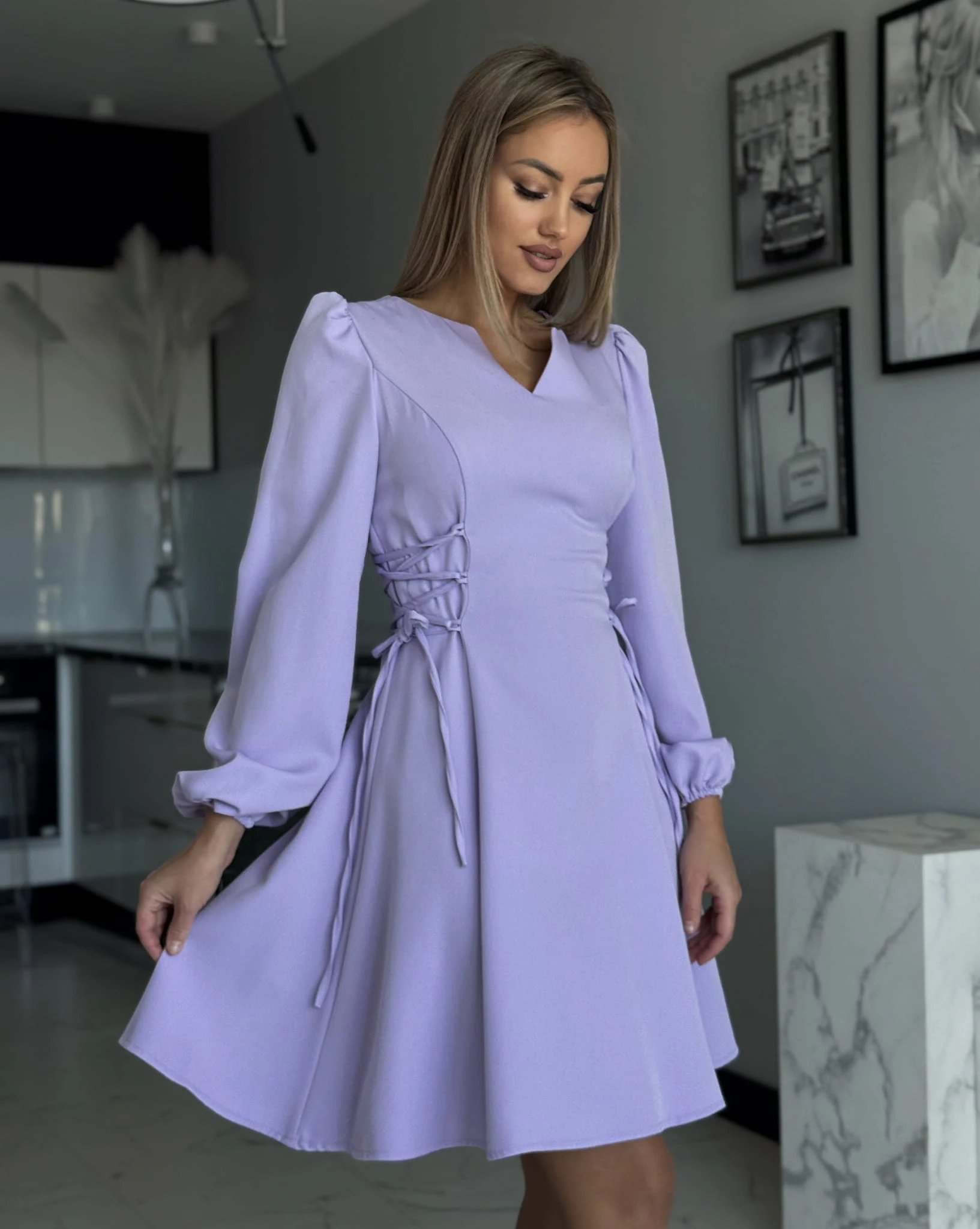 Model wyróżnia się efektownymi wiązaniami po bokach w pasie, które nie tylko przyciągają uwagę, ale także pozwalają na idealne dopasowanie sukienki do sylwetki, podkreślając talię. Dekolt w kształcie subtelnego serka dodaje lekkości i elegancji, a długie bufiaste rękawy nadają całości romantycznego stylu.