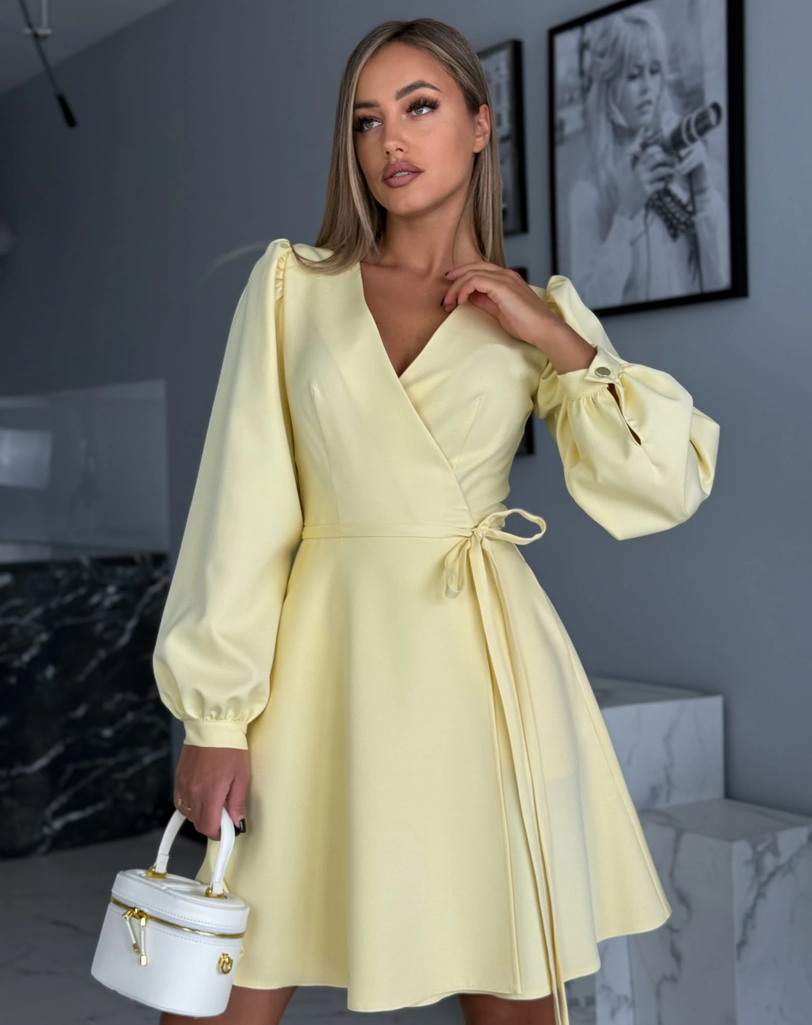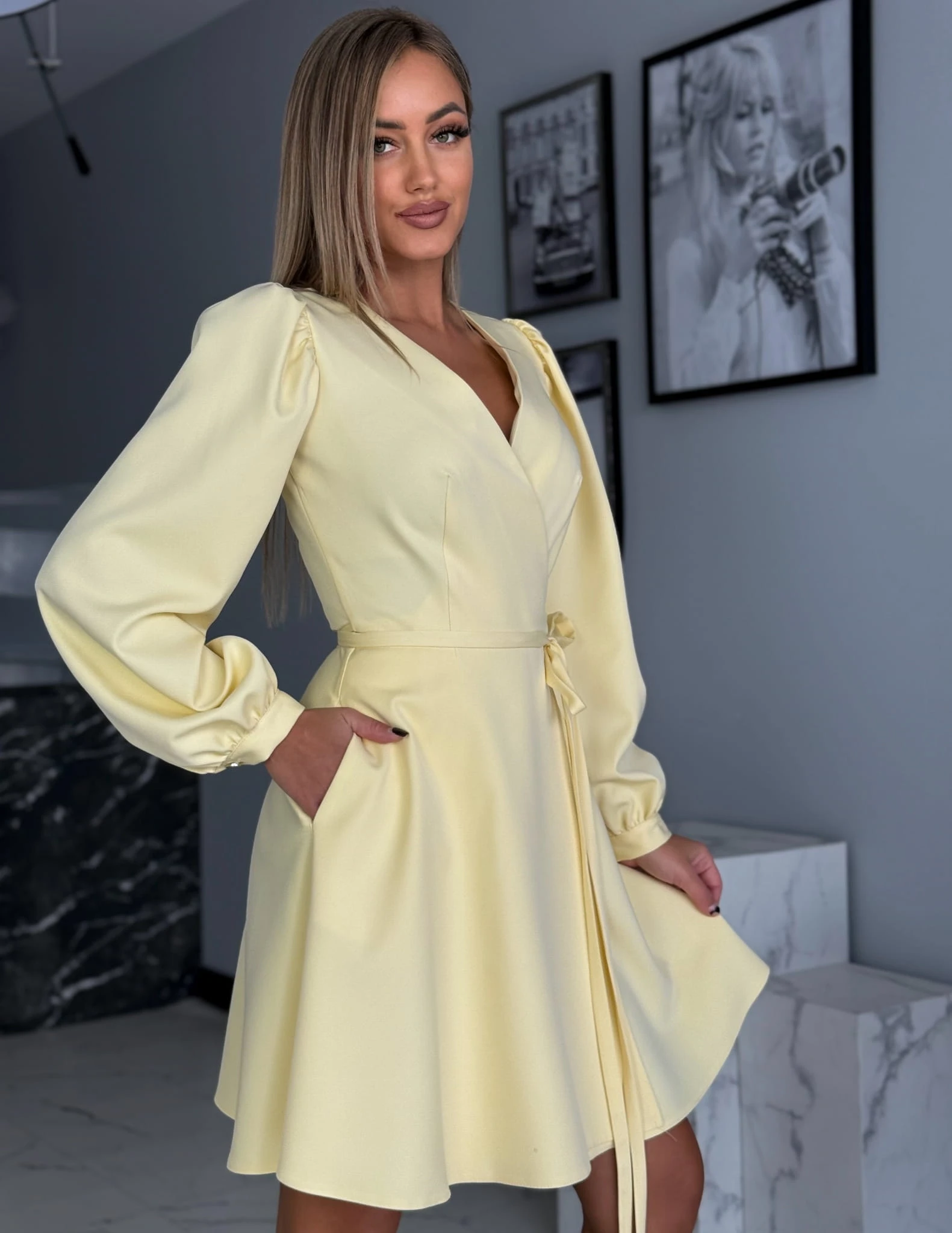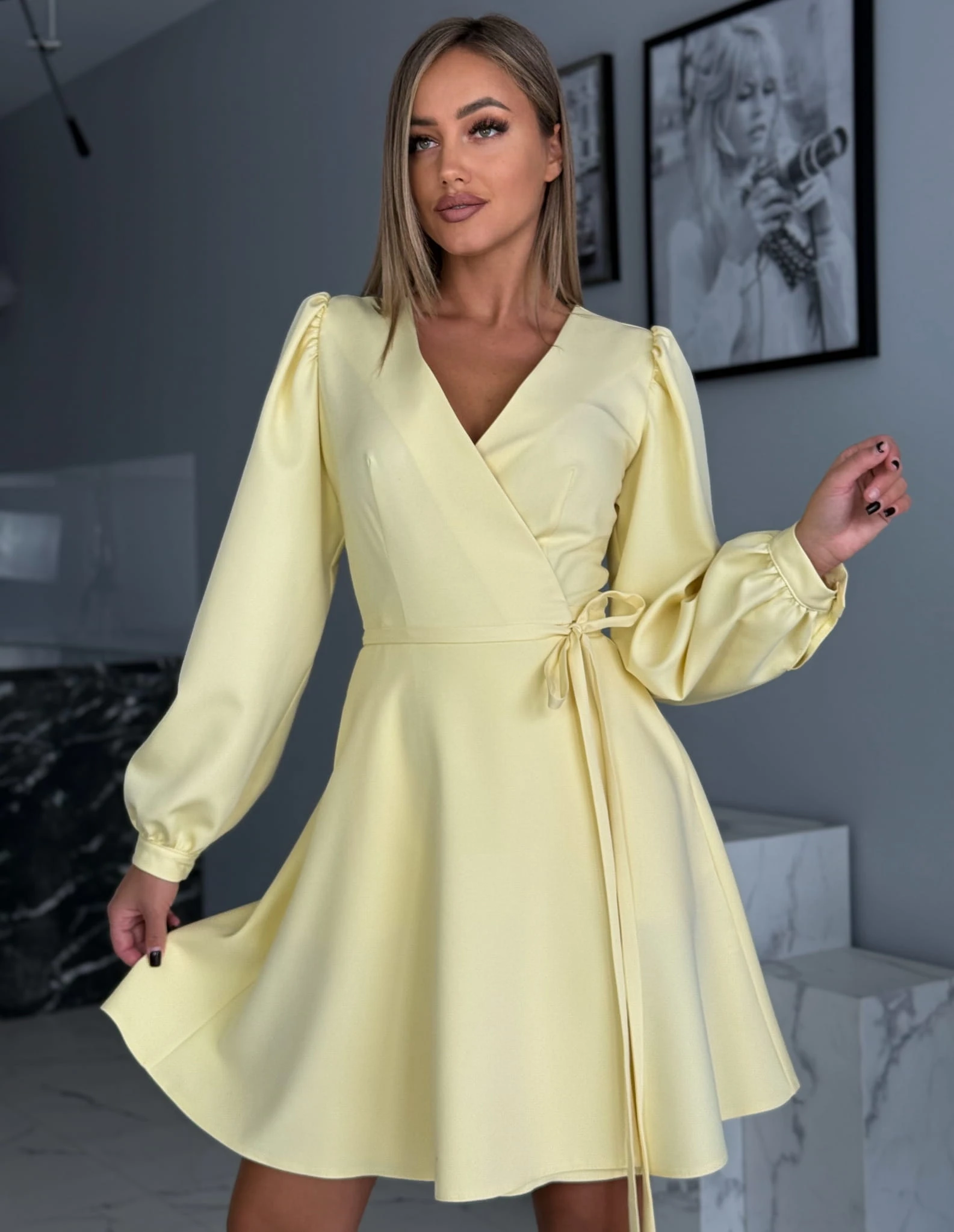 Elegancka sukienka w kolorze żółci, zaprojektowana z myślą o kobietach ceniących klasykę z nutą nowoczesności. Rozkloszowany krój typu dzwonek pięknie układa się w ruchu i podkreśla sylwetkę, a długość przed kolano nadaje jej lekkości i uniwersalnego charakteru - idealna zarówno na przyjęcia, jak i spotkania wizytowe.