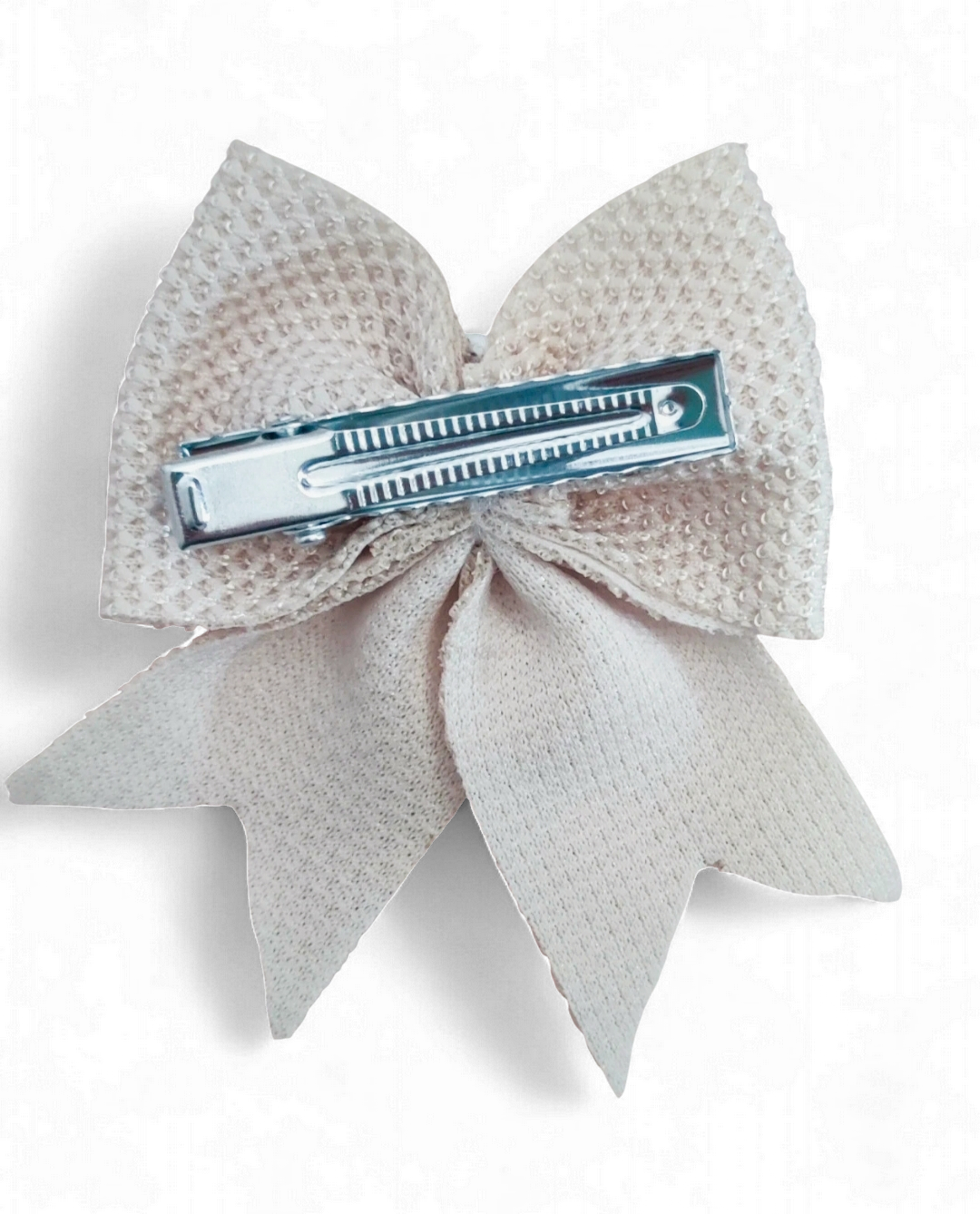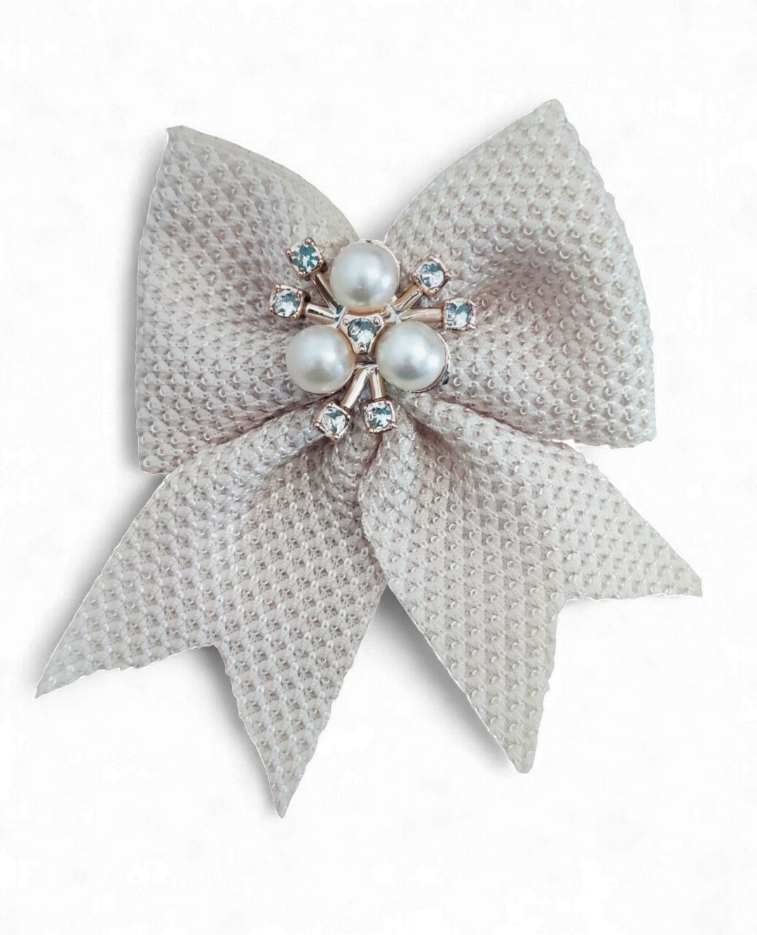 Elegancka spinka w kształcie tłoczonej kokardki, ozdobiona subtelnymi perełkami i błyszczącymi cyrkoniami. Delikatna i urocza - doskonała na co dzień, do przedszkola, jak i na wyjątkowe okazje: urodziny, święta, sesje zdjęciowe.