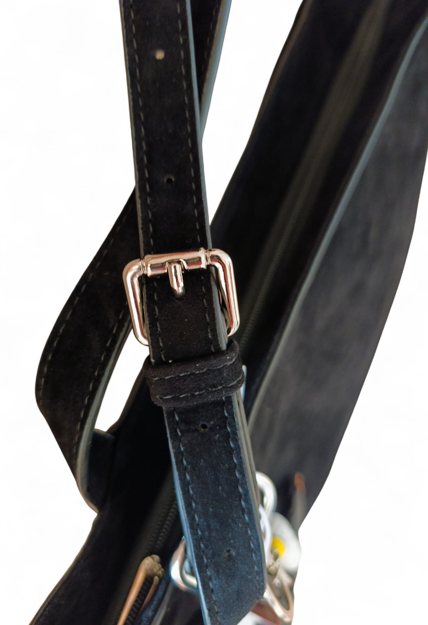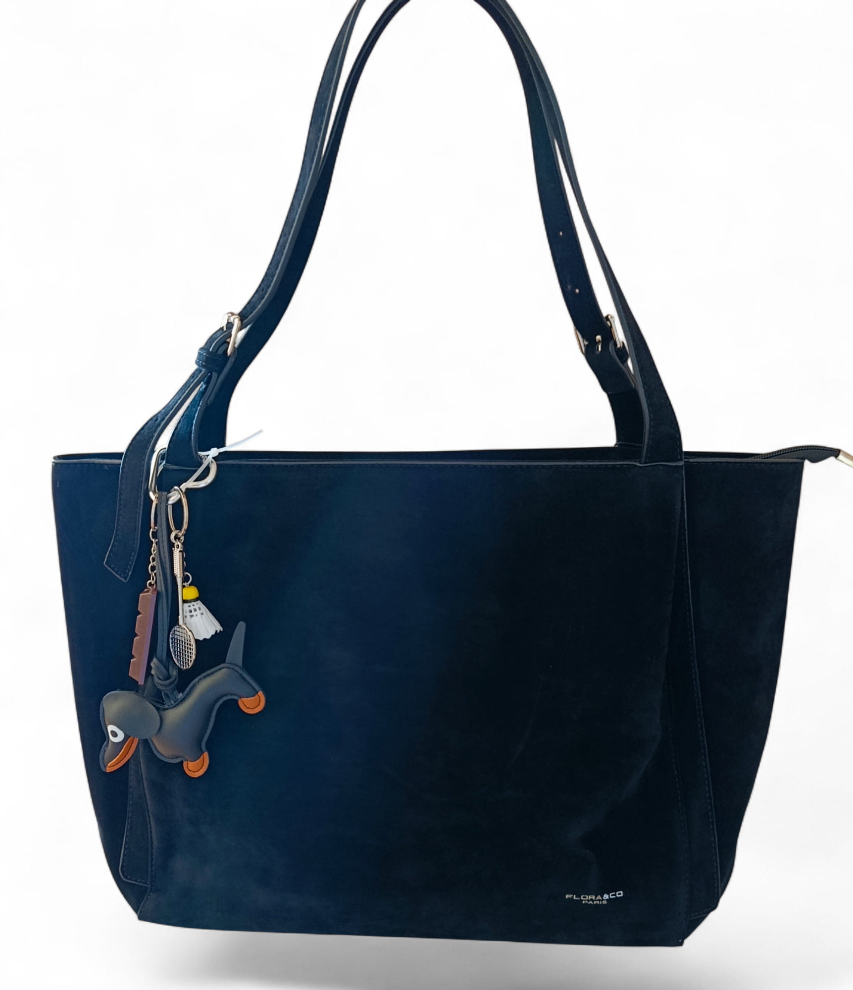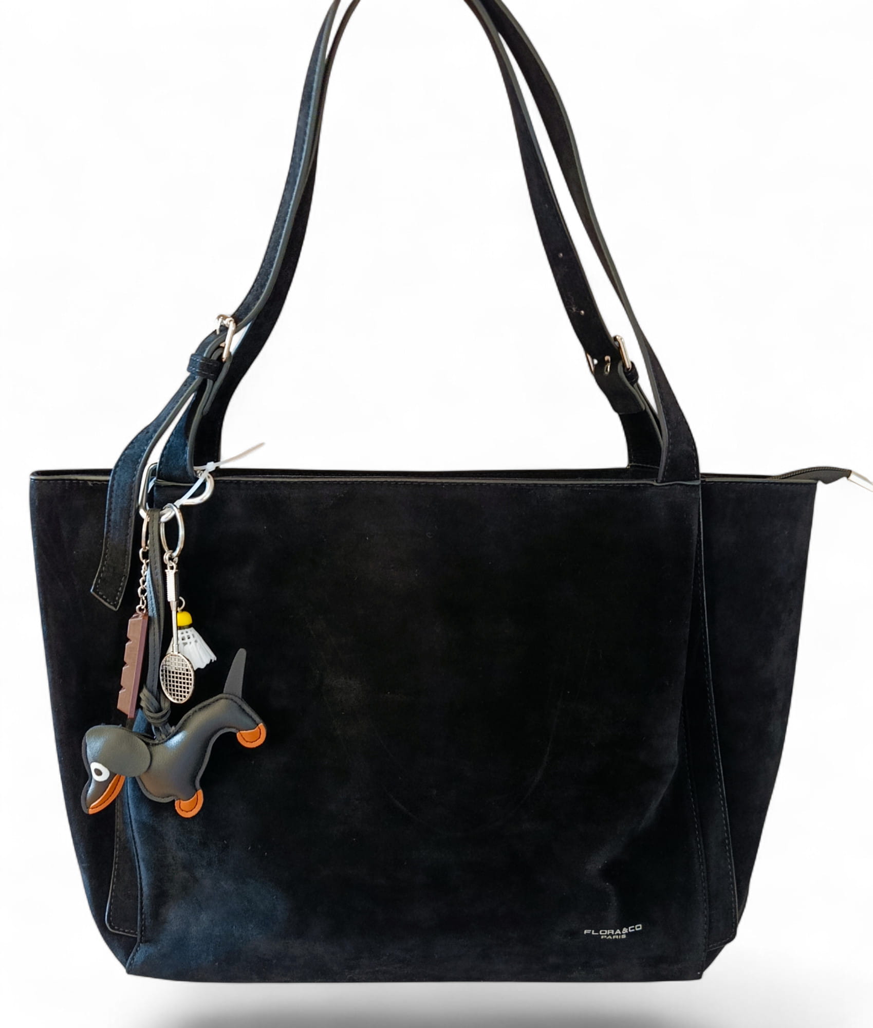 Pojemna torebka damska z dużą komorą oraz dodatkowymi kieszonkami, zamykana na zamek błyskawiczny. Paski regulowane, środek wyściełany pięknym i miękkim materiałem w kwiatki. Do torebki dołączone zostały breloki, które uzupełniają całą stylizację (piesek, tabliczka czekolady oraz paletka z lotką).