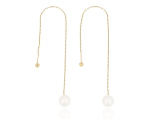 Całość zwieńczona jest dużą, elegancką perłą, która nadaje biżuterii ponadczasowego charakteru i klasy. Kolczyki posiadają oryginalne zapięcie - przeciąga się je przez dziurkę w uchu, a następnie zabezpiecza poprzez zakręcenie małej, złotej kuleczki. Takie rozwiązanie zapewnia stabilność i gwarancję, że kolczyki nie wypadną.