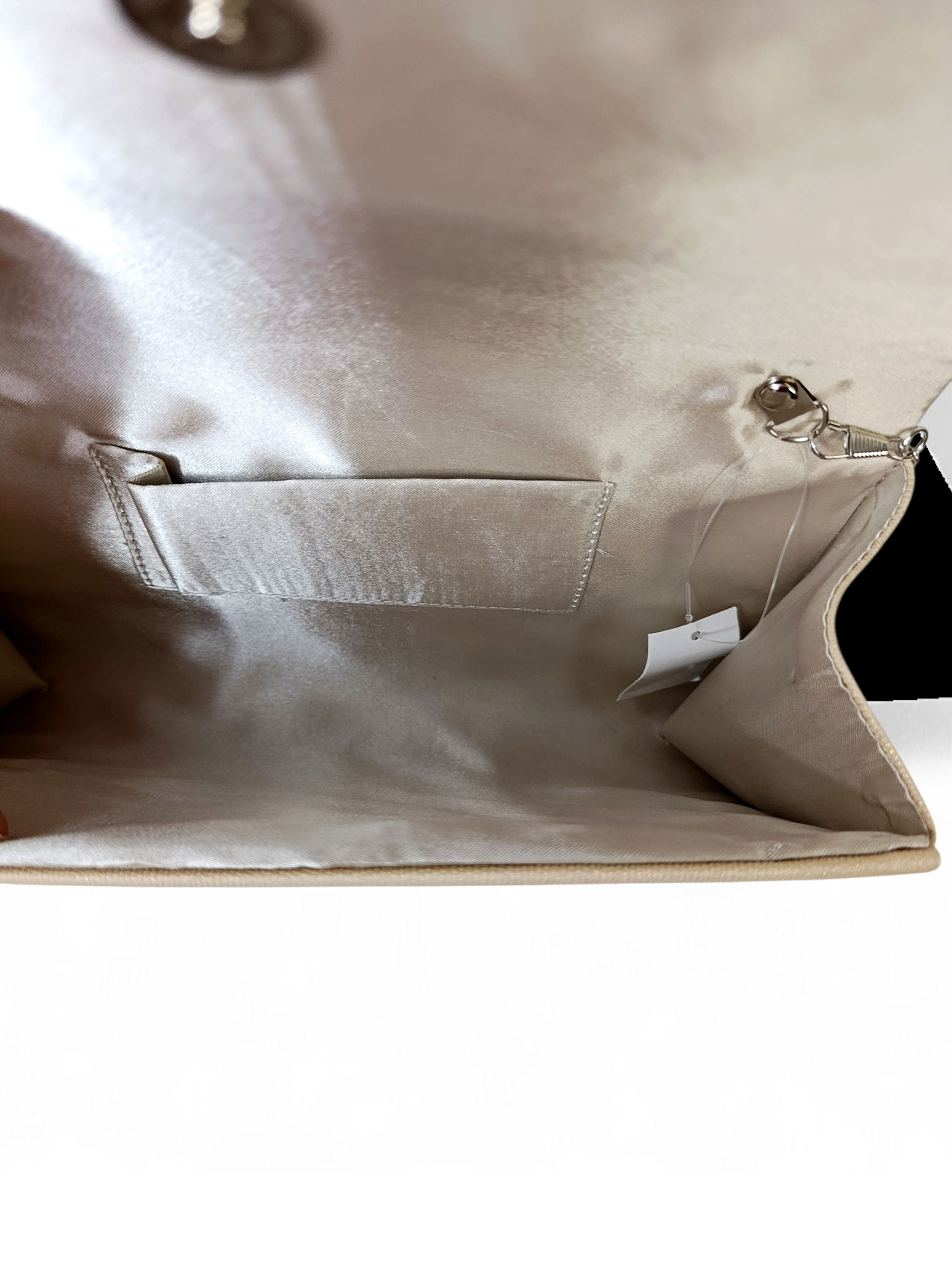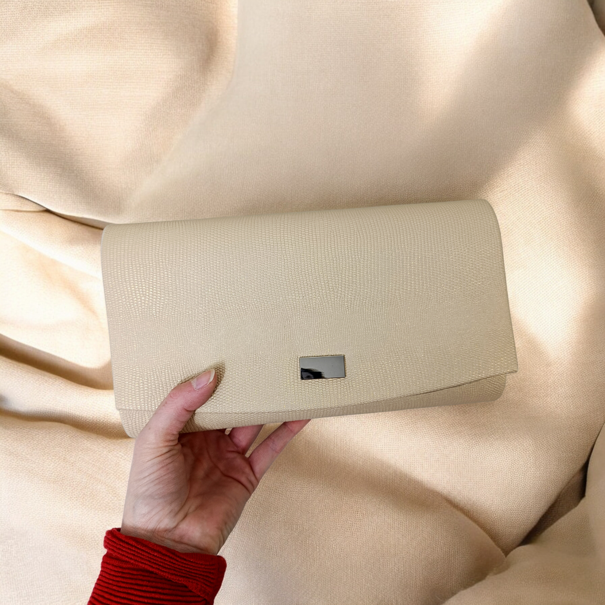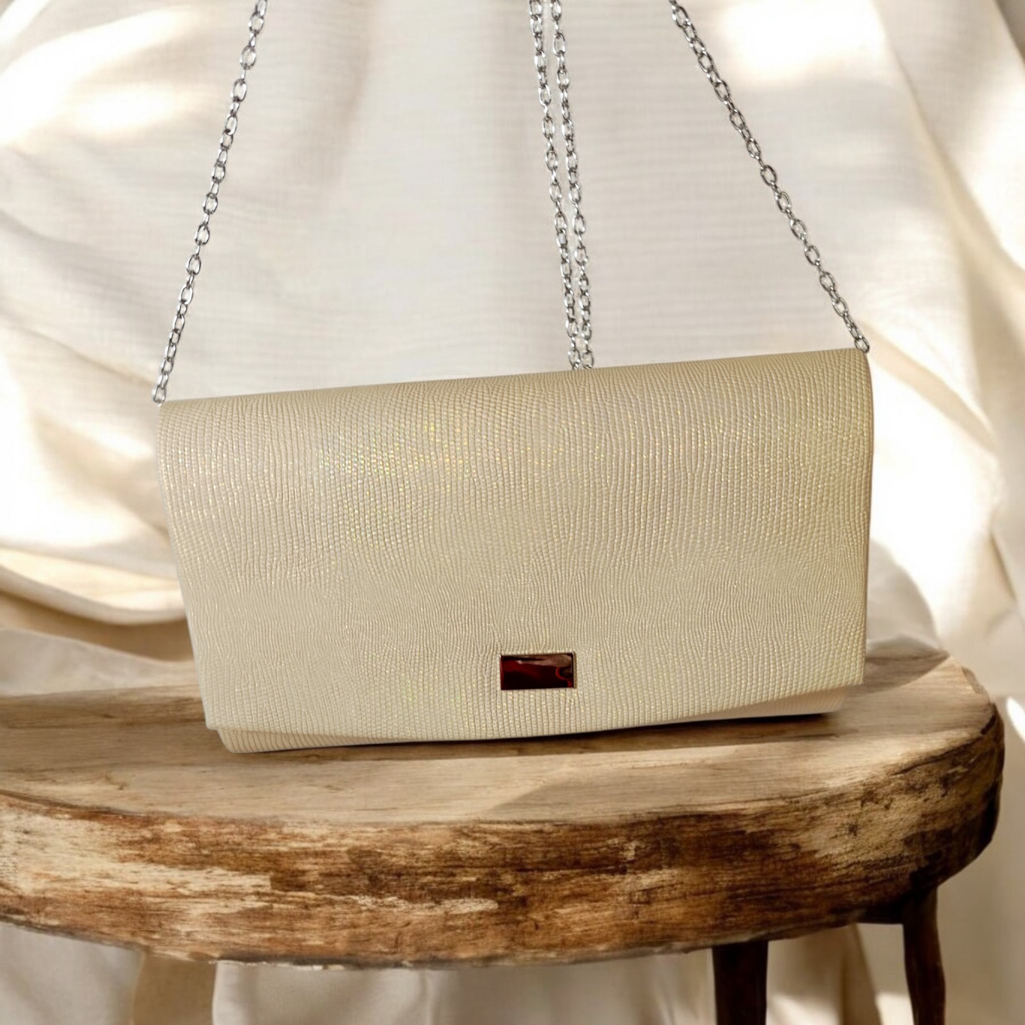 Zachwyć wszystkich subtelnym blaskiem i ponadczasowością elegancją. Ta elegancka kopertówka w kolorze kremowo-złotym to coś więcej niż torebka - to dopełnienie Twojego stylu, Twojej pewności siebie i Twojego wyjątkowego wieczoru.