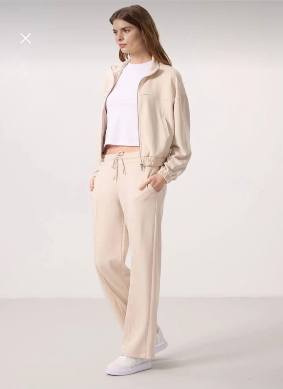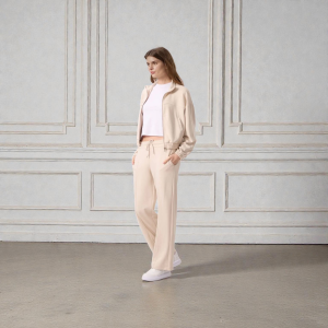 Wygodny beżowy dres z szeroką nogawką i bluzą rozpinaną