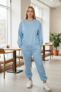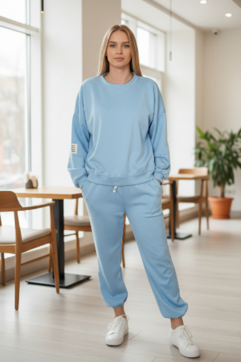 Błękitny dres damski w modnym fasonie oversize to idealny wybór na co dzień, do domu, na spacer czy niezobowiązujące wyjścia.