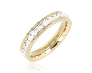 Elegancka obrączka damska w złotym kolorze to doskonałe połączenie klasyki i nowoczesnego blasku. Jej wyjątkowy charakter podkreśla subtelny rządek lśniących cyrkonii, poprowadzony przez sam środek pierścionka, który pięknie odbija światło i przyciąga spojrzenia.