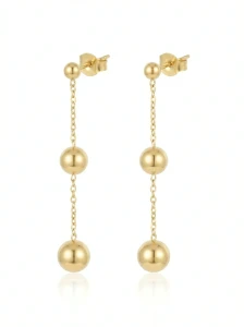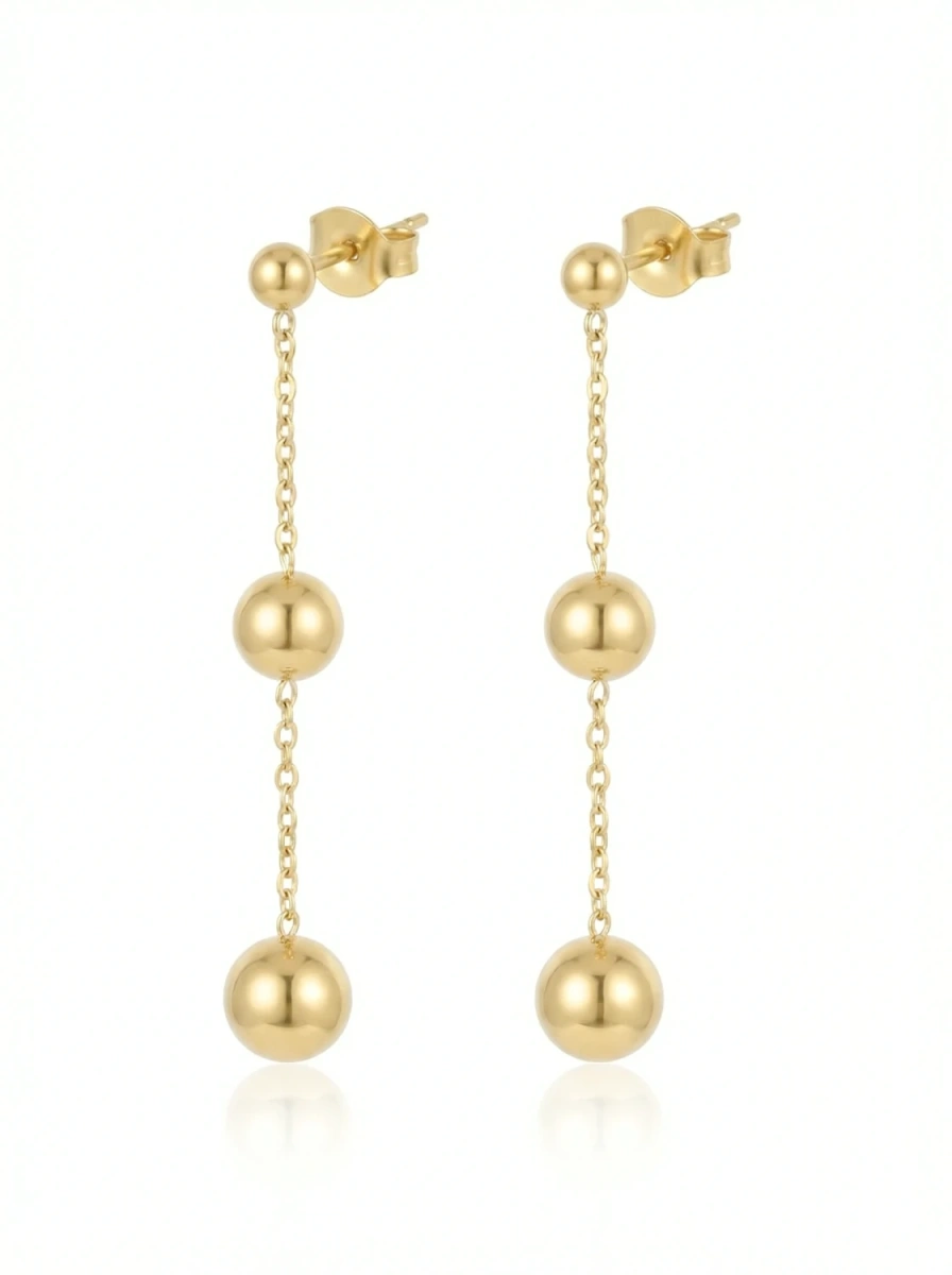 Stylowe kolczyki damskie wiszące z motywem złotych kulek to ponadczasowy dodatek, który podkreśli każdą stylizację. Wykonane z wysokiej jakości stali chirurgicznej 316L i pokryte 14- karatowym złotem, są trwałe, odporne na zarysowania i bezpieczne dla skóry. Subtelny łańcuszek dodaje im lekkości i elegancji, tworząc modny, kobiecy efekt.